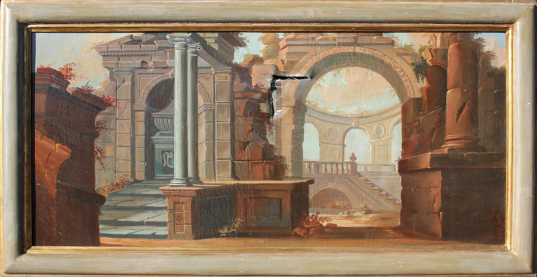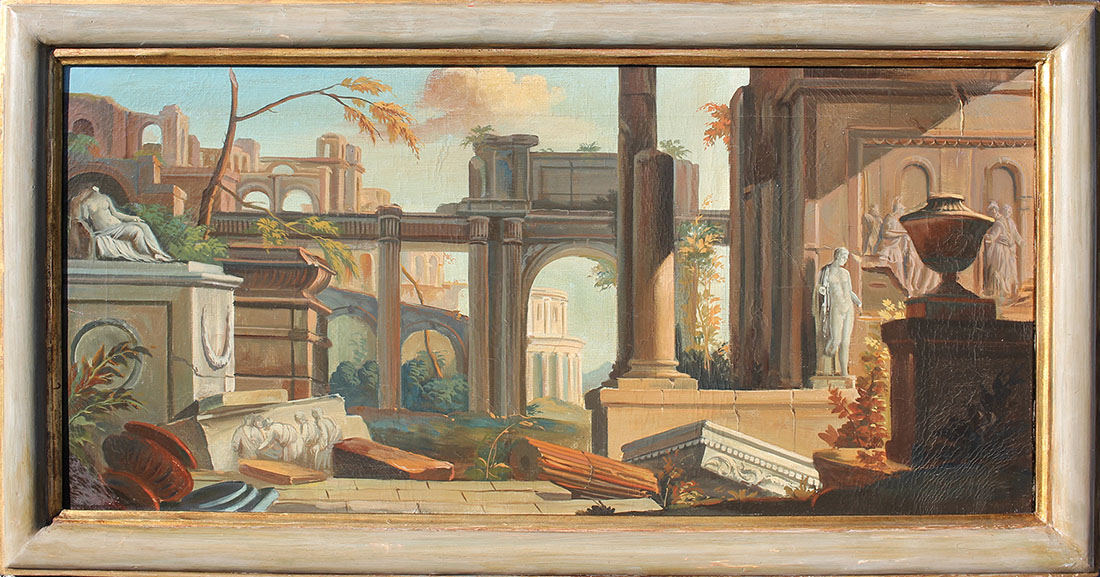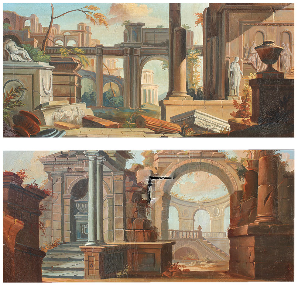 PAIR OF NEOCLASSICAL STYLE PAINTINGS OF ROMAN RUINS: Oil/Canvas, 18'' x 38'', no visible signatures, matching painted frames, 22'' x 42''.