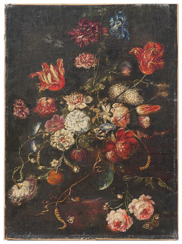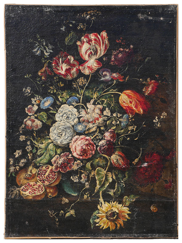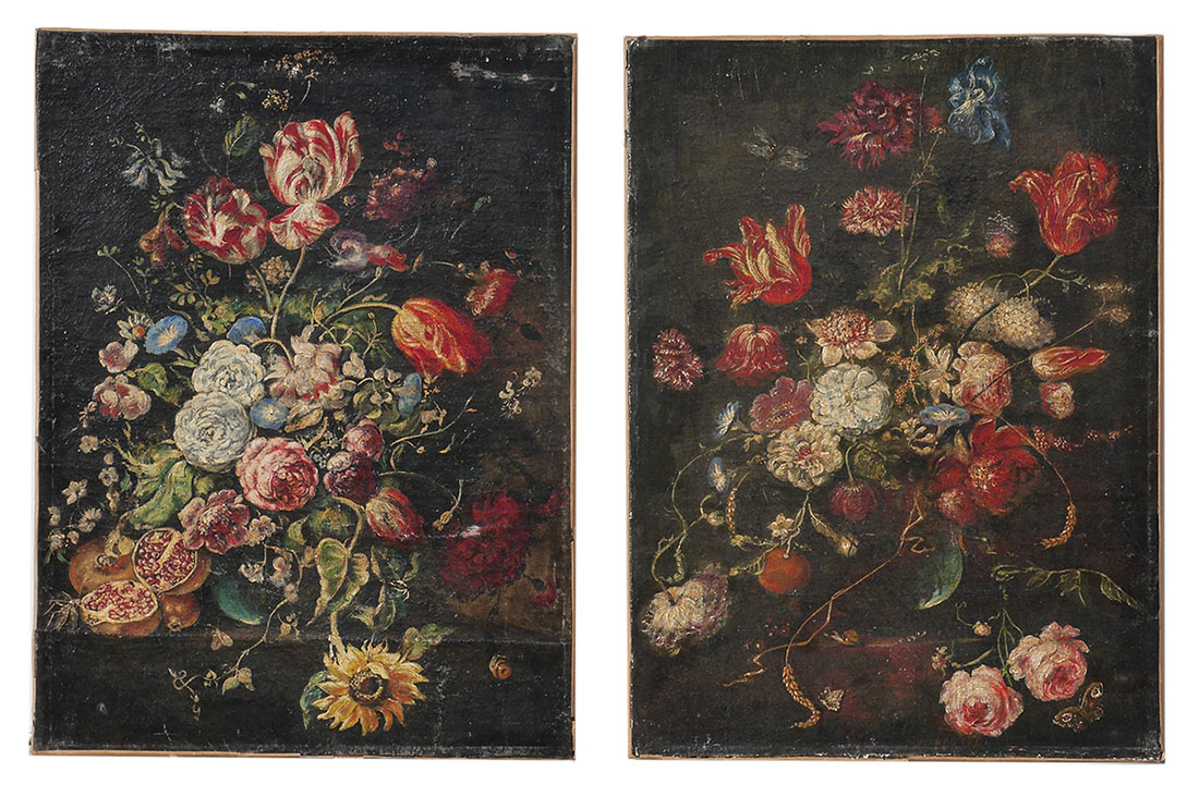 TWO EARLY OLD MASTER STYLE FLORAL STILL LIFE PAINTINGS: Oil/Canvas, 25.75'' X 19'', unframed.