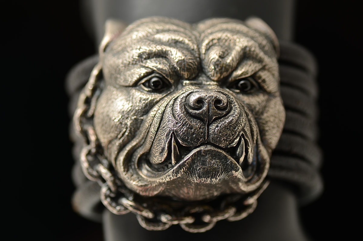 SCOTT KAY STERLING & LEATHER BULLDOG BRACELET: Pit Bull bracelet is a three-dimensional sculpture in 925 Sterling Silver. The silver Pit Bull dog head measures 1.5'' tall and 1.125'' inches wide and designed by Scott Kay.