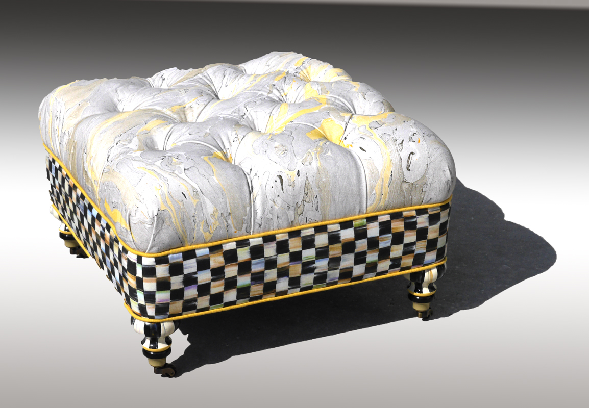 MACKENZIE-CHILDS COURTLY PALAZZO OTTOMAN: This ottoman compliments the previous wing chair lot 1084, current retail price $2,495, overall 17'' h. x 26'' x 26''.