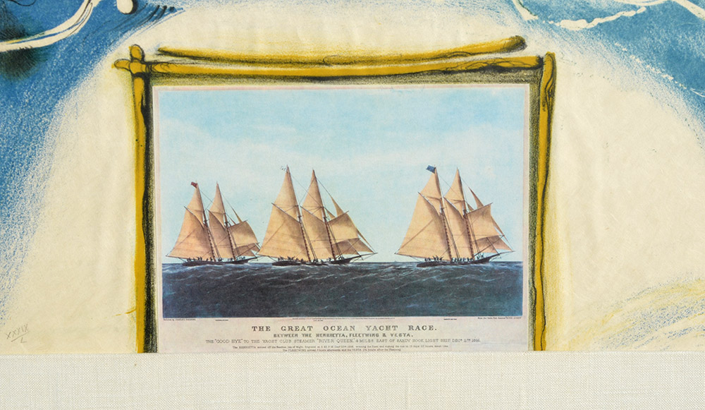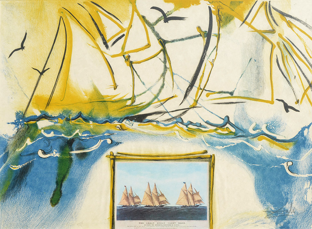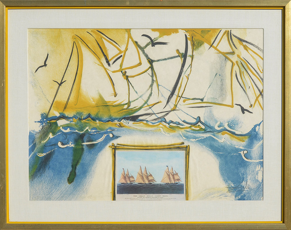 SALVADOR DALI AMERICAN YACHTING SCENE: Lithograph with Collage, sight size 21.5'' x 29.5'', pencil signed lower right, numbered in lower left XXXIX/L, framed 28.5'' x 36.5''. Frame shows minor wear, not examined out of the frame, sold as is.