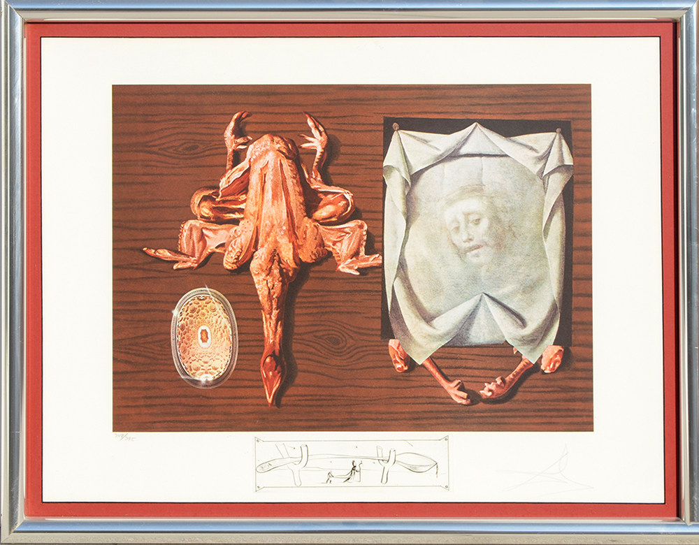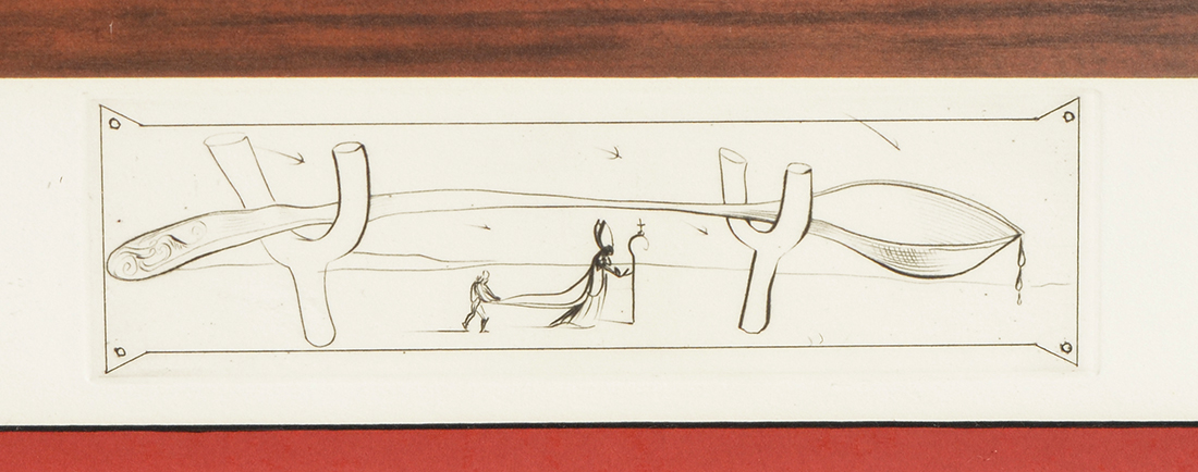 SALVADOR DALI FROM LES DINERS DE GALA: ''Les Spoutniks Astiques Elasticots Statistiques'', Photolithograph with ''Spoon in Crutches'' Engraving, pencil signed lower right, numbered lower left, framed.