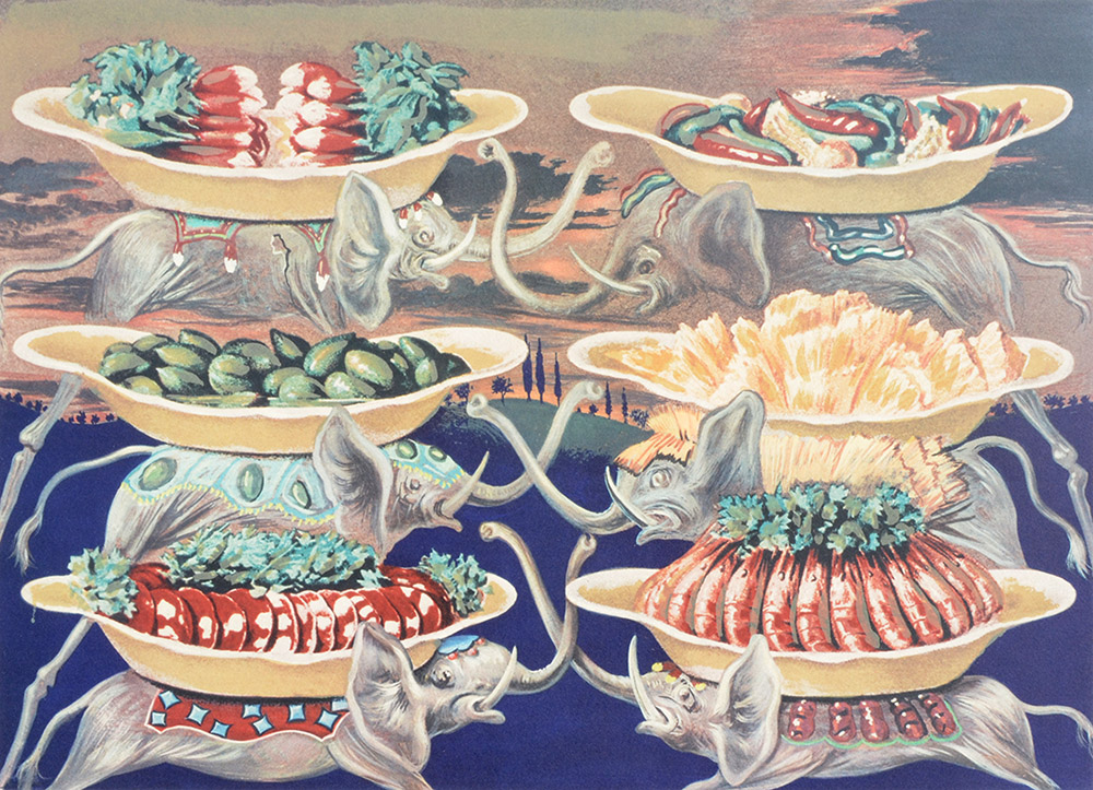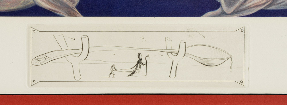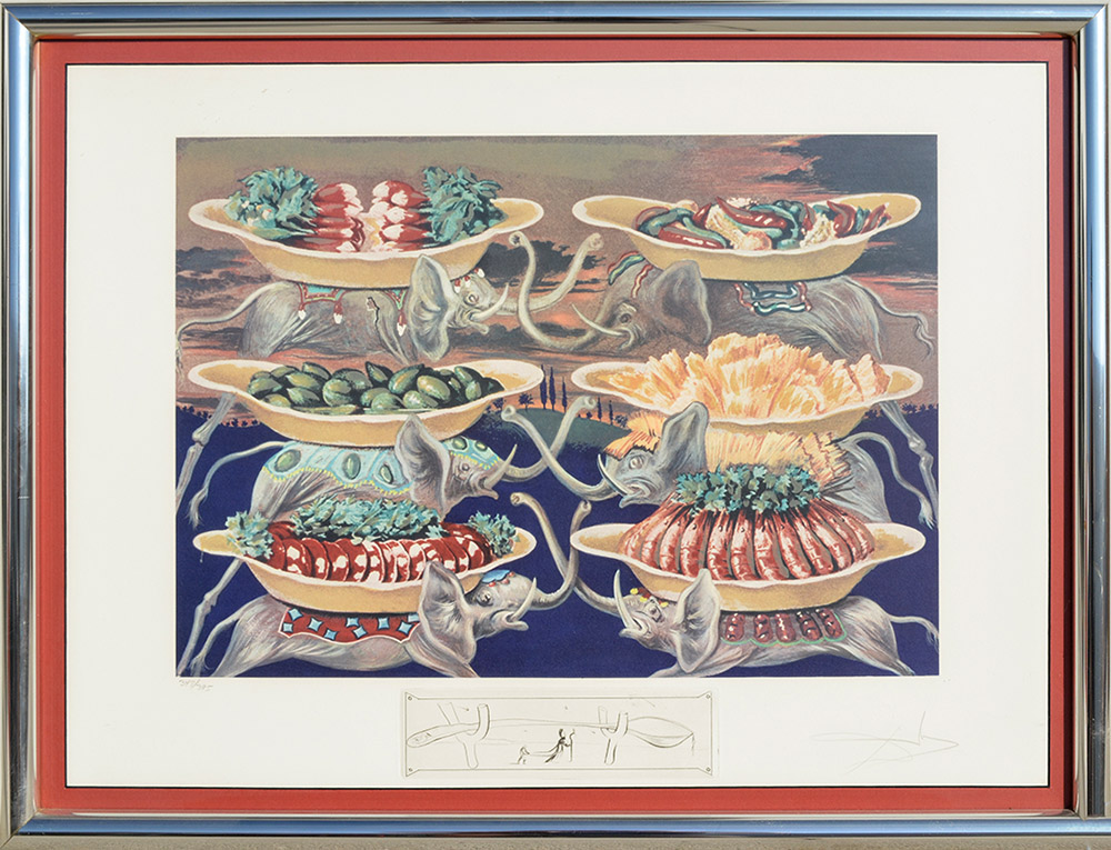 SALVADOR DALI FROM LES DINERS DE GALA: ''Les Delices Petits Martyrs'', Photolithograph with ''Spoon in Crutches'' Engraving, sight size 21.25'' x 28.5'', pencil signed lower right, numbered lower left CCCXLVIII/CCCXCV, framed, 25.5'' x 32.5''.