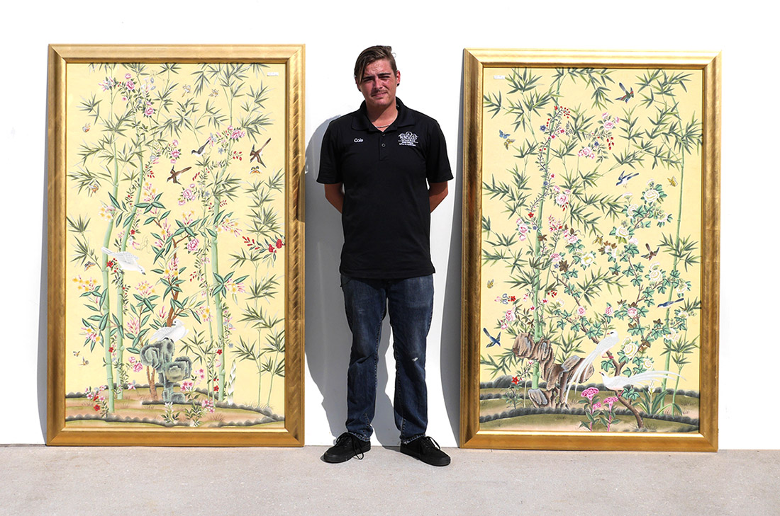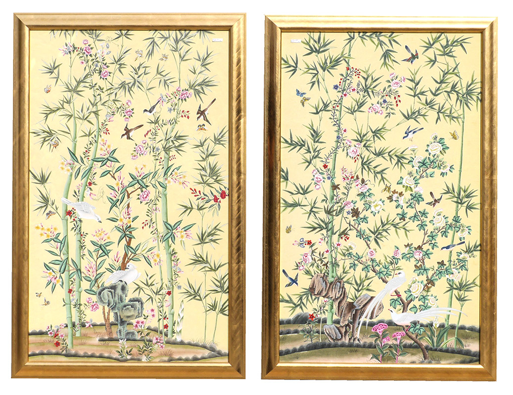 2 LARGE ORIENTAL MOTIF FLORAL PAINTINGS: Overall measurements with frame, Watercolor on Silk, 65'' x 41.5'', Scenes Depict Various Birds and Butterflies, reportedly purchased from Chelsea House.