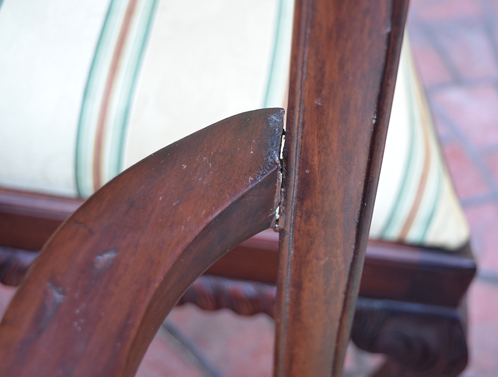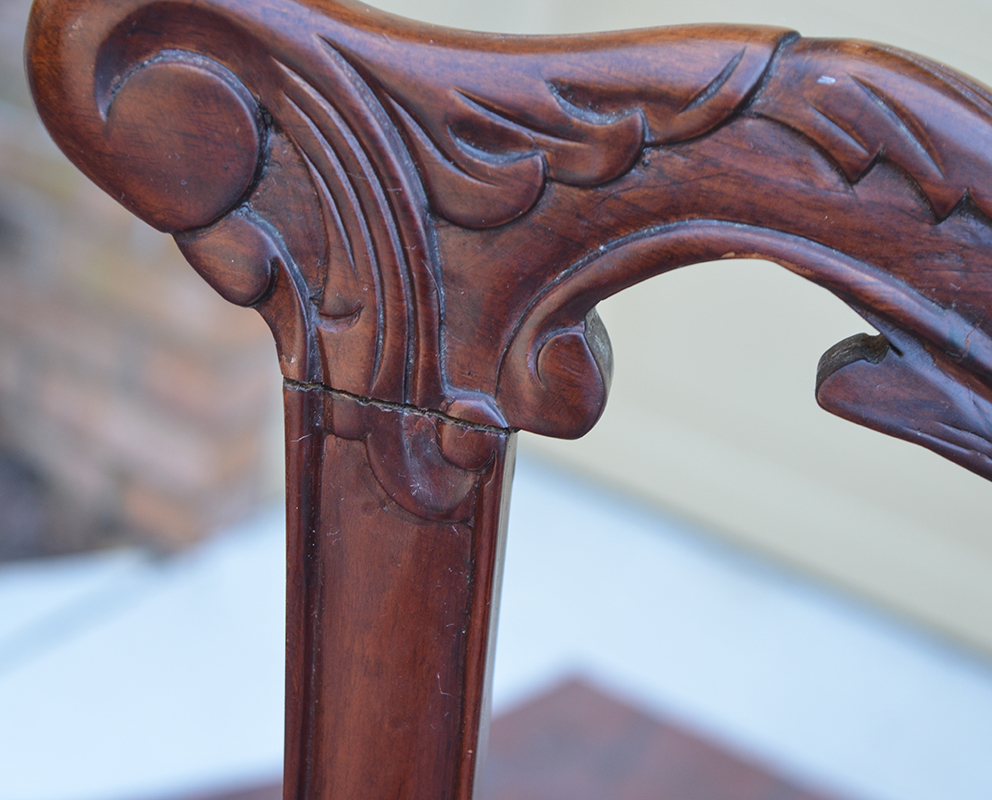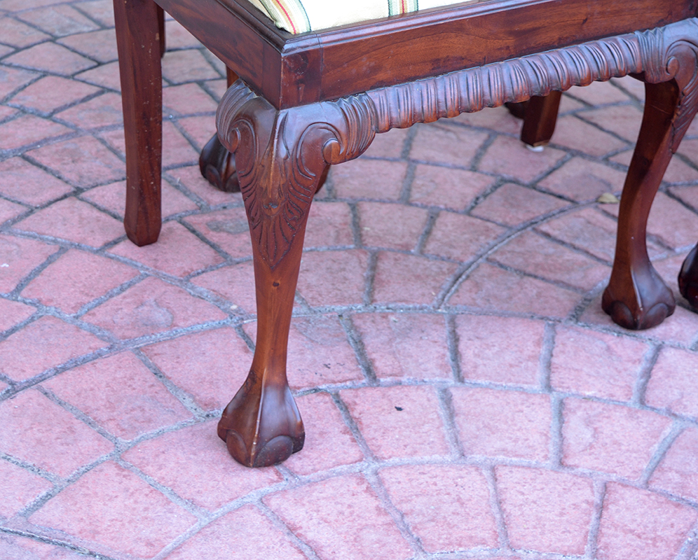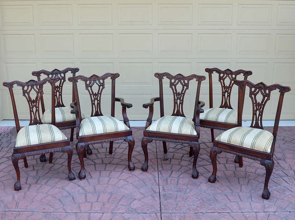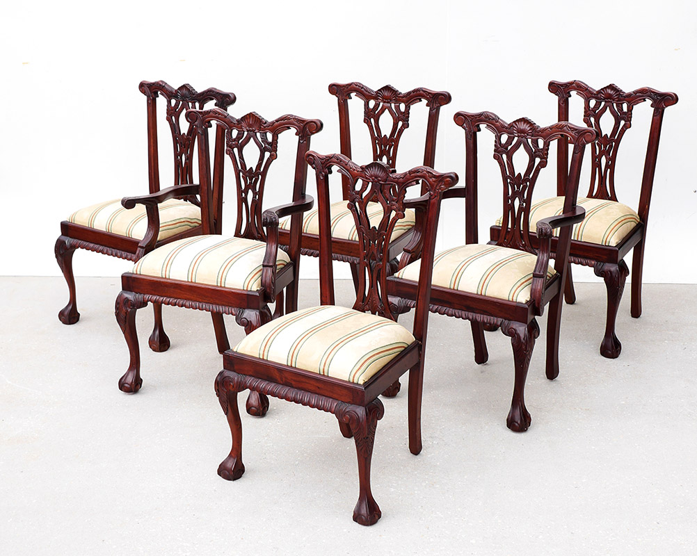 6 CARVED CHIPPENDALE STYLE CHAIRS: Carved and shaped backs, arms, supports and front legs. Striped pattern upholstery, 2 captains and 4 sides. Captain measures 39 1/2'' h. x 26'' x 21''.