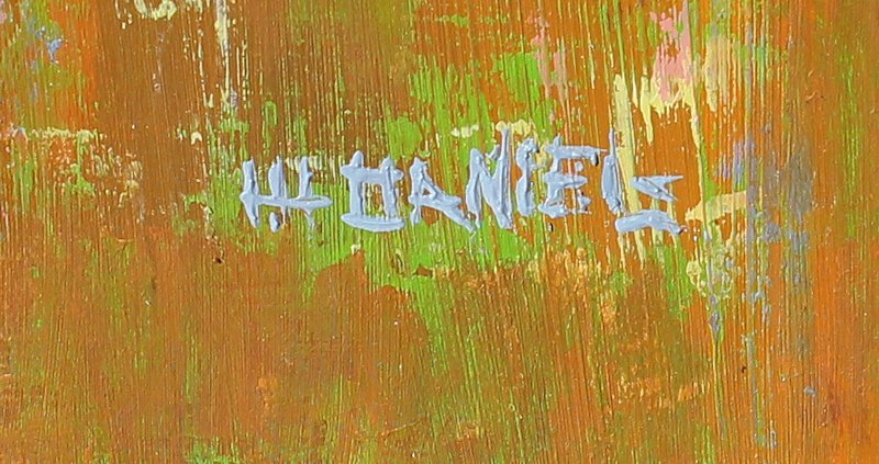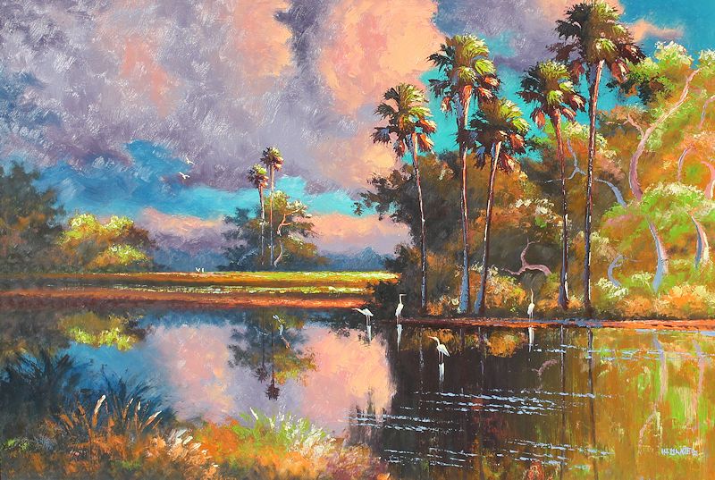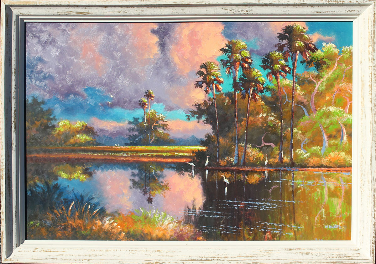 DANIELS, Willie, (American, 20th Century): Vibrant Florida Highwaymen river scene with birds, Oil/Masonite, signed lower right, 24'' x 36'', framed 27 1/2'' x 39 1/2''.