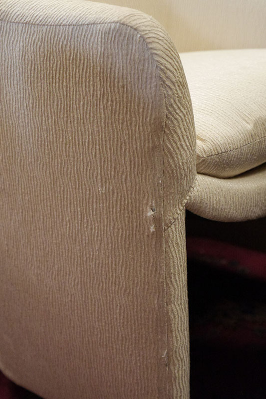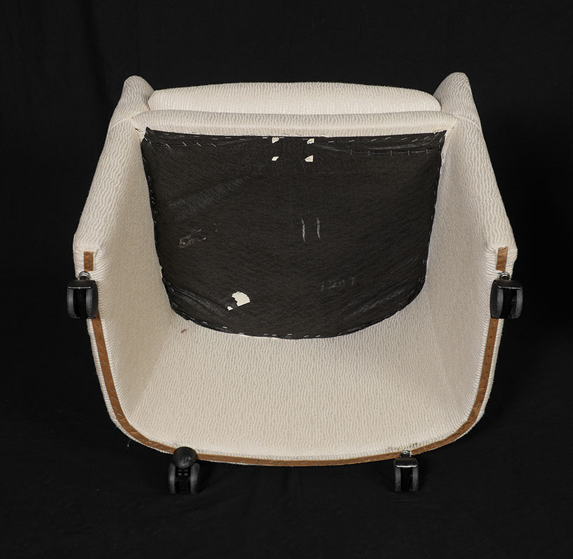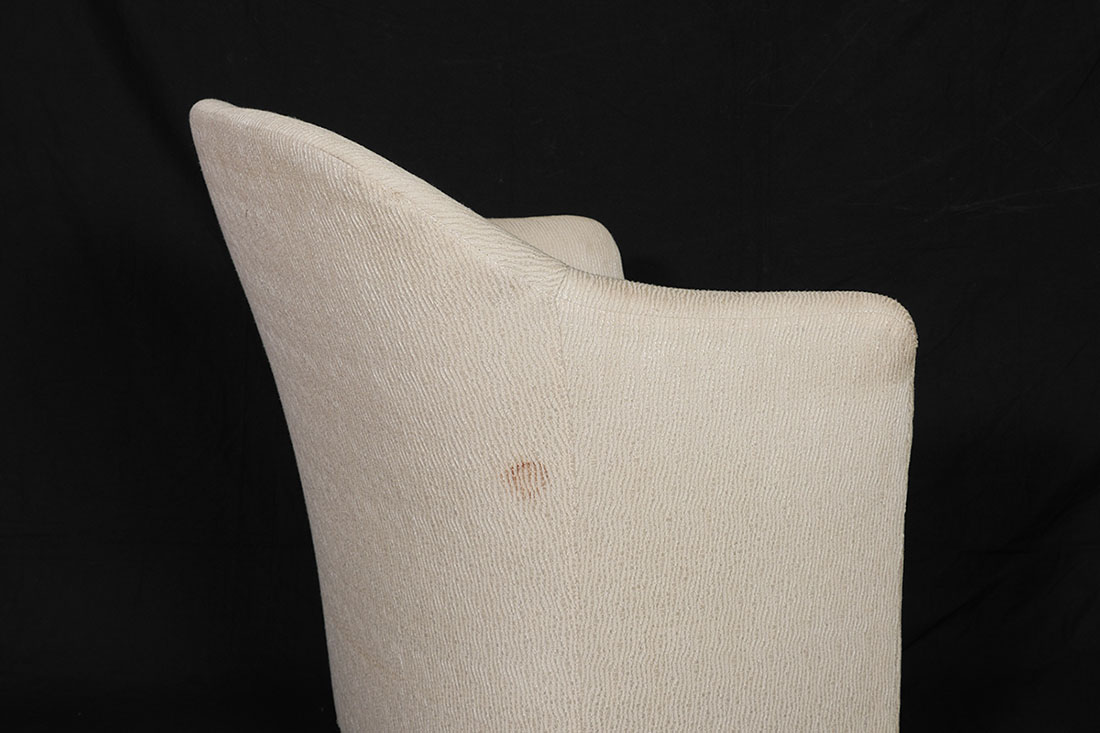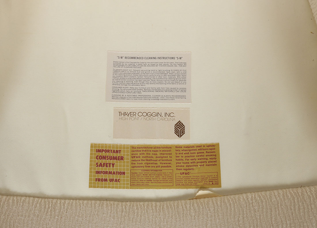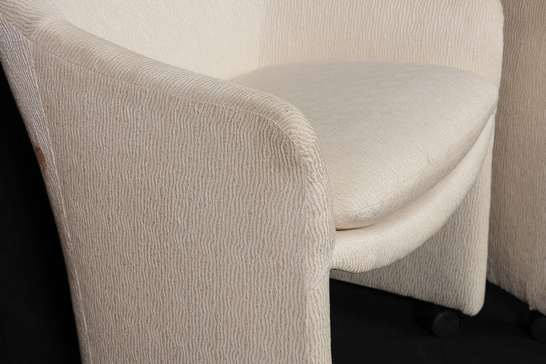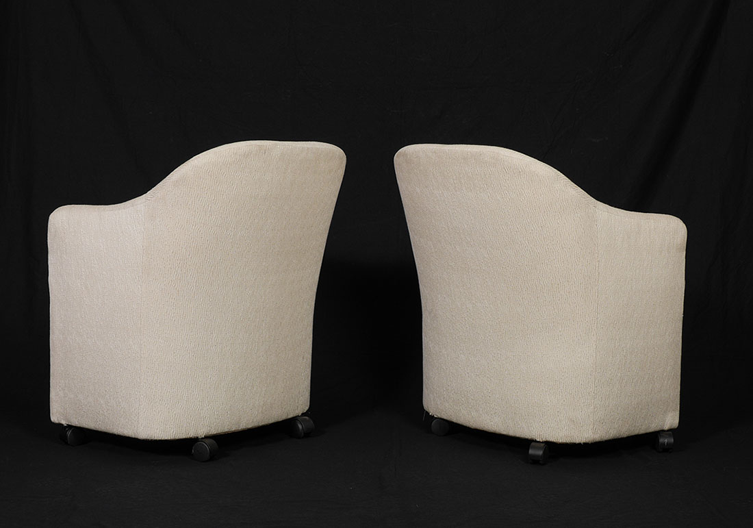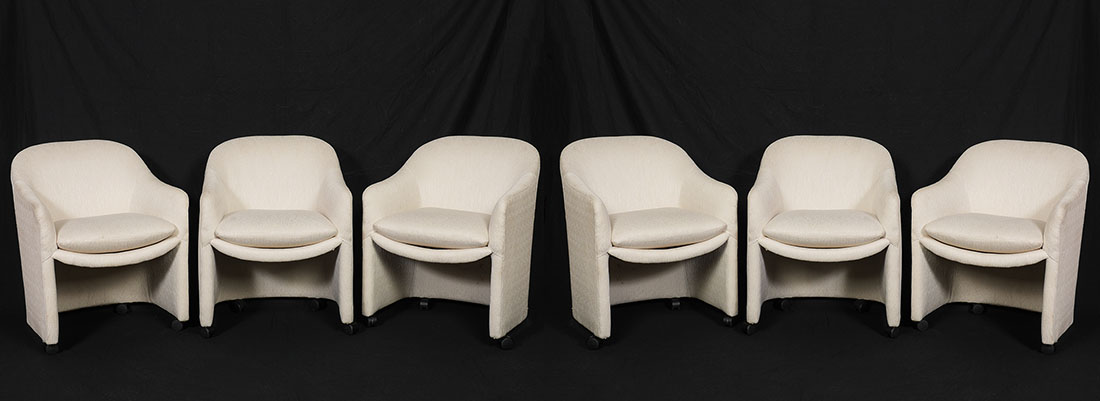 6 UPHOLSTERED THAYER COGGIN CHAIRS: Fully upholstered in patterned white upholstery, shaped back, on 4 castors, Thayer Coggin label on seat. Overall 31 1/4'' h. x 24 1/2'' x 23 1/2''.