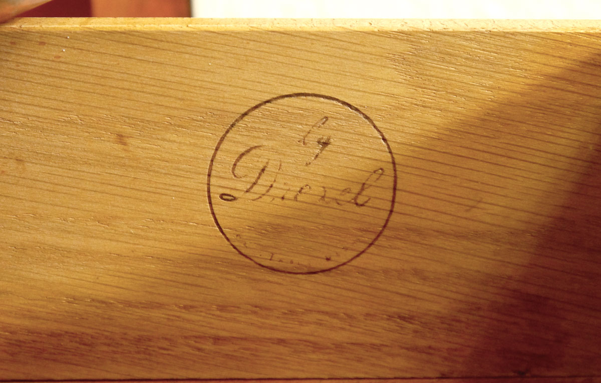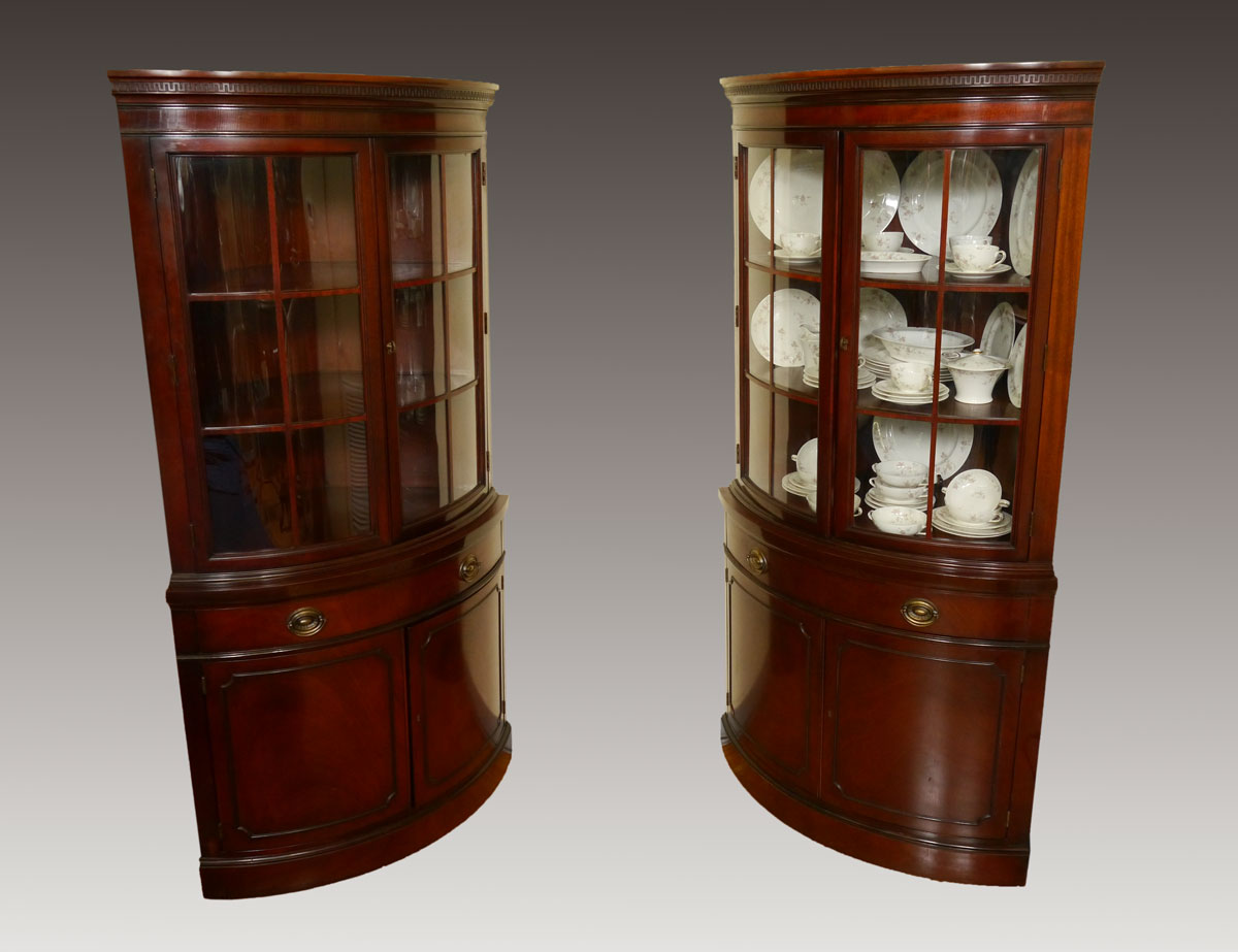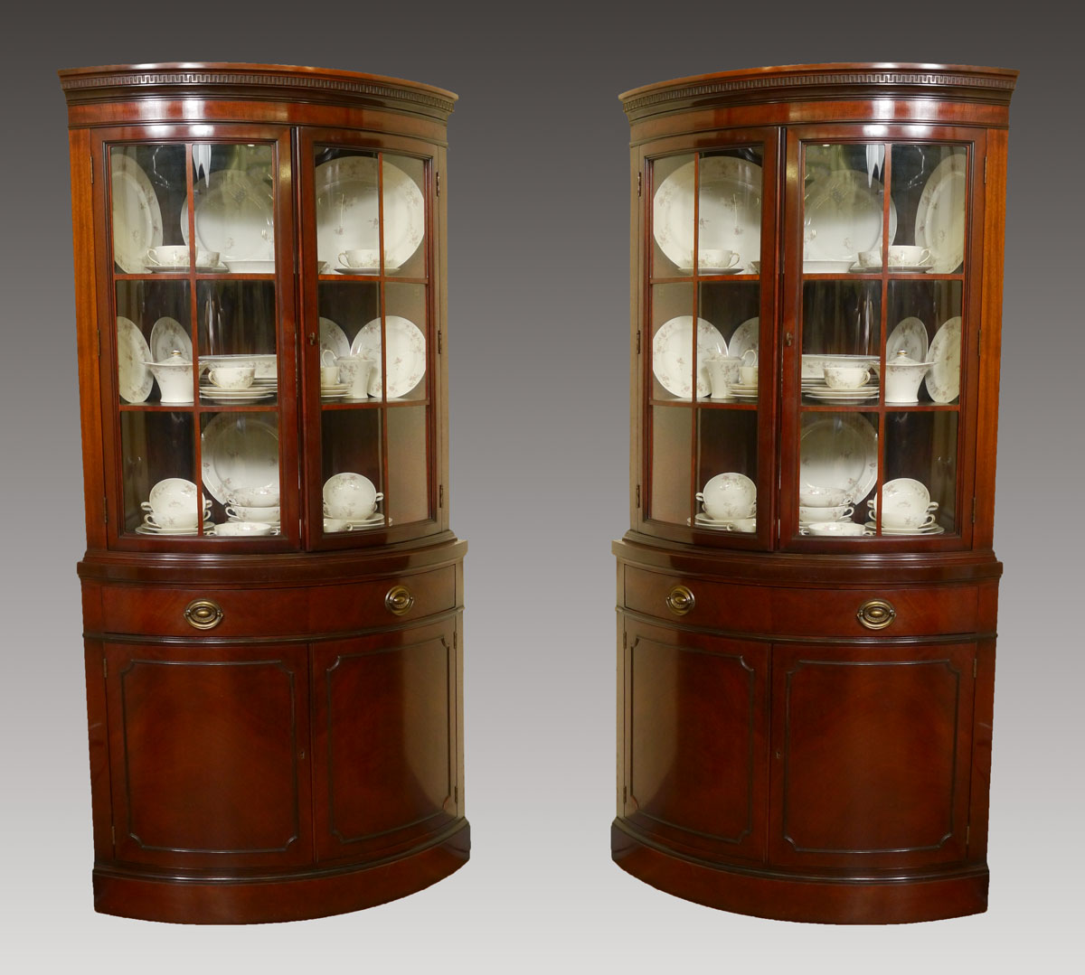 PAIR DREXEL TRAVIS COURT MAHOGANY CORNER CABINETS: Bow front classical styled china cabinets. Greek key molding, curved front with 2 glass doors over drawer over 2 doors. 70'' h. x 35'' x 20 3/4''.