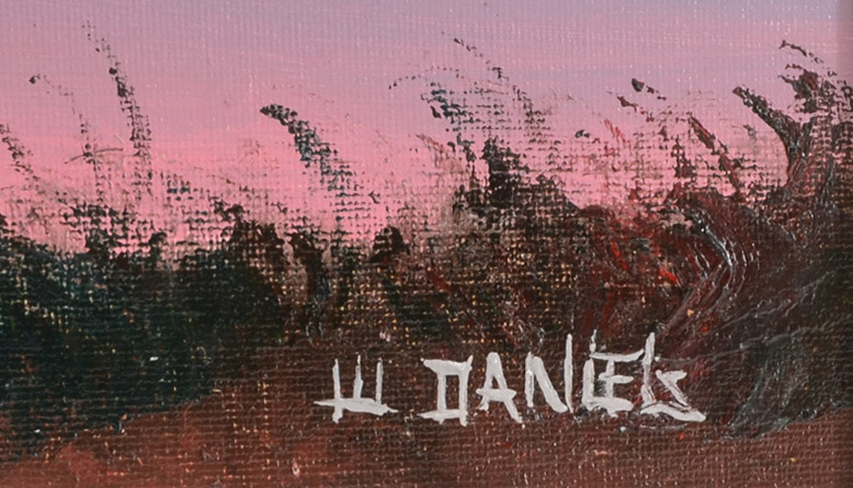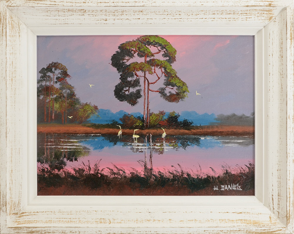 DANIELS, Willie, (American, 20th Century): Florida Highwaymen sunrise backwaters scene with stand of trees and birds, signed lower right, 12'' x 16'', framed 15 1/2'' x 19 1/2''.
