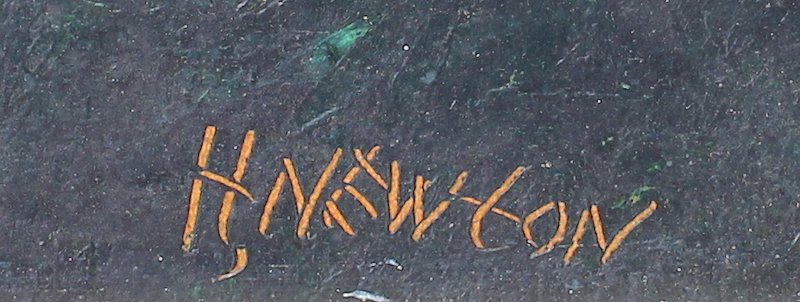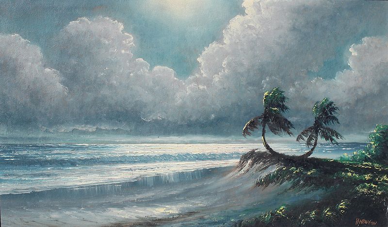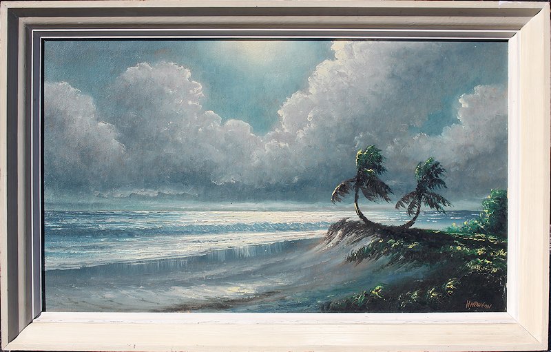 NEWTON, Harold, (American, 1934-1994): Sofa size Florida Highwaymen ''Rio Mar'' scene with stormy skies, Oil/Upson, signed lower right, 24'' x 40'', framed 29 1/4'' x 45 1/4''.