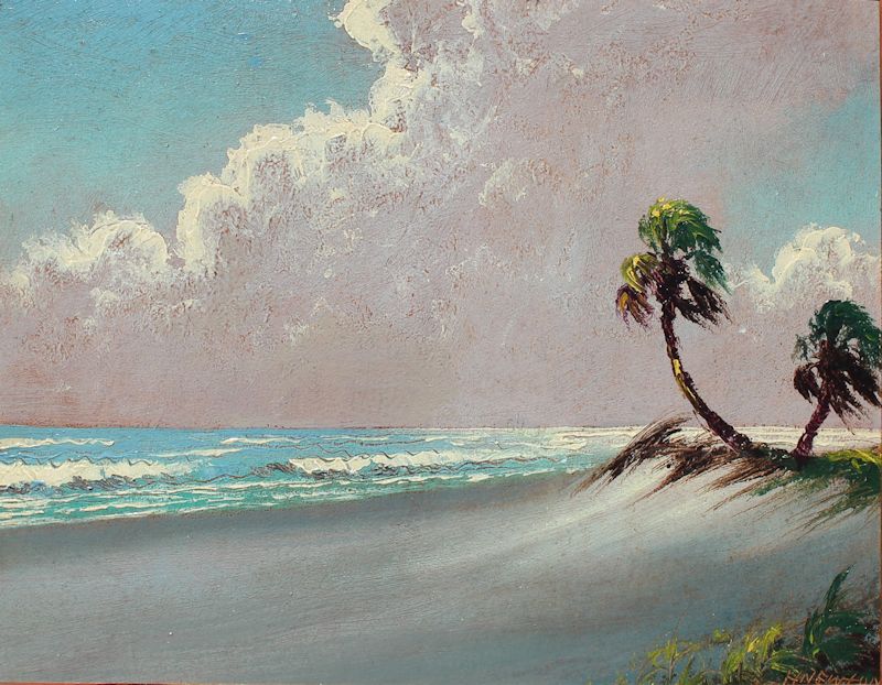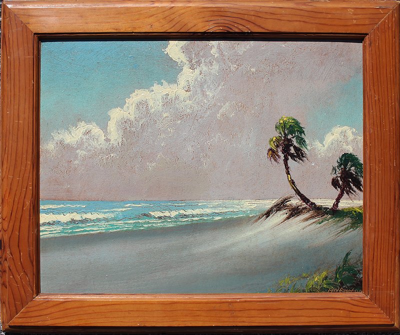 NEWTON, Harold, (American, 1934-1994): Florida Highwaymen ''Rio Mar'' beach scene, Oil on Upson, signed lower right, 15 3/4'' x 20'', framed 20'' x 24''.