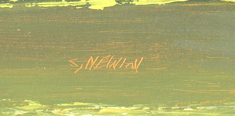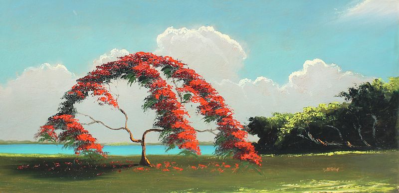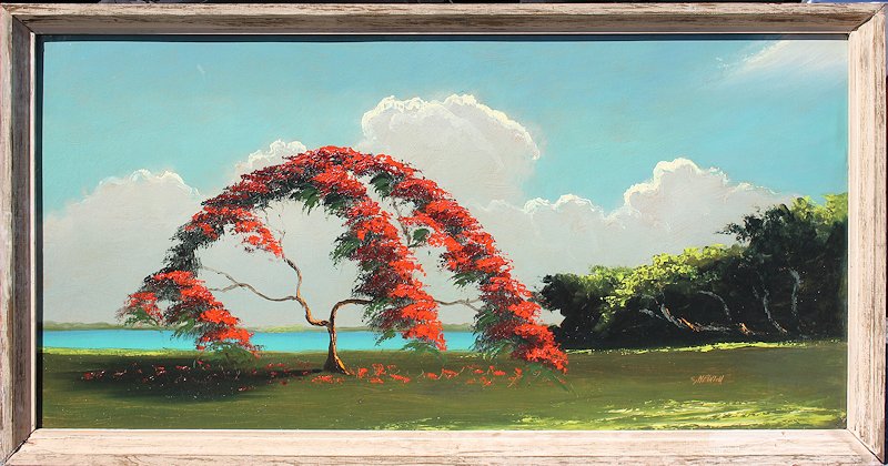NEWTON, Sam, (American, 20th Century): Florida Highwaymen Royal Poinciana at waters edge, Oil/Upson, signed lower right, 24'' x 48'', framed 26 1/2'' x 51''.