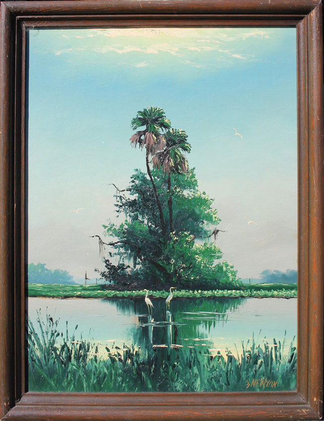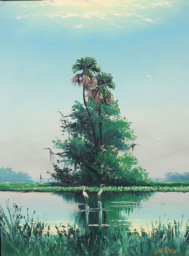 NEWTON, Sam, (American, 20th Century): Florida Highwaymen St. Johns River backwater scene with stand of trees and birds, Oil/Upson, 24'' x 18'', framed 26 1/4'' x 20 1/4''.
