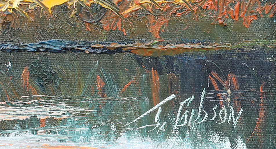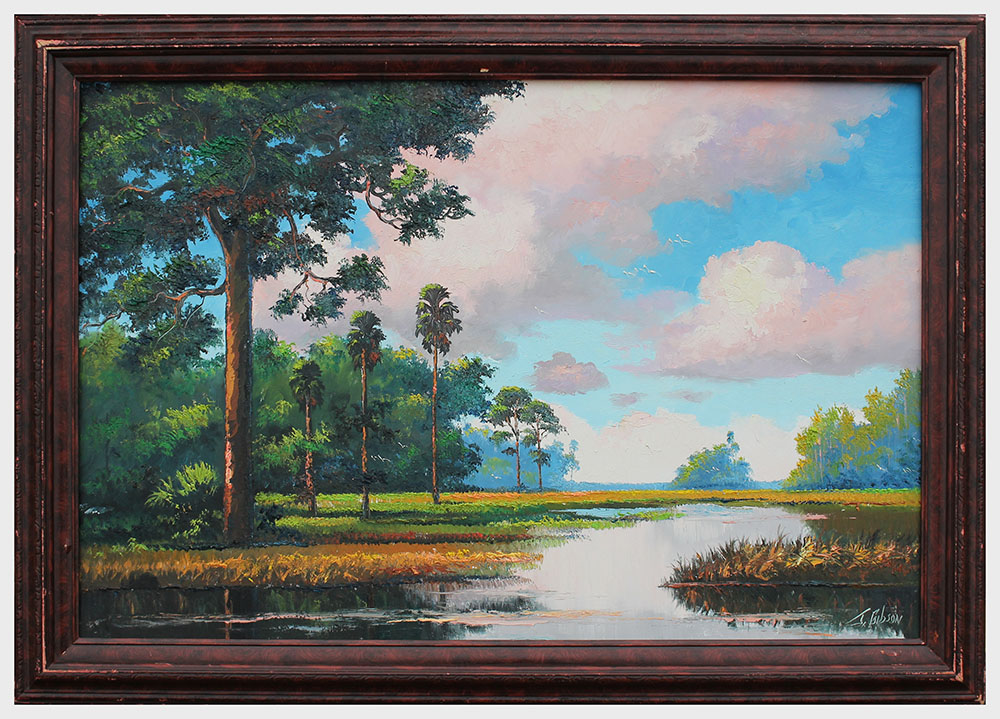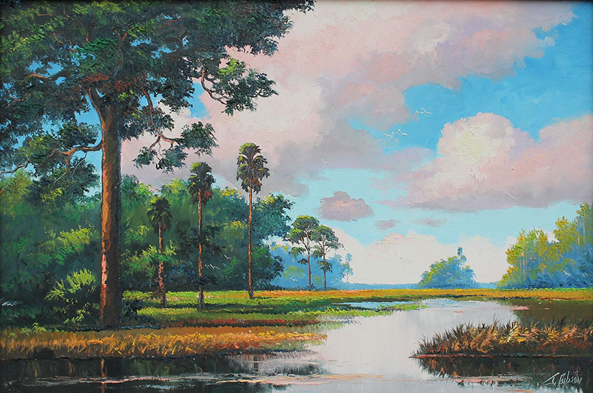GIBSON, James, (American, 20th Century): Vibrant Florida Highwaymen St. Johns River scene with pink clouds, Oil/Canvas, signed lower right, 24'' x 36'', framed 29 1/4'' x 4 1 1/2''.