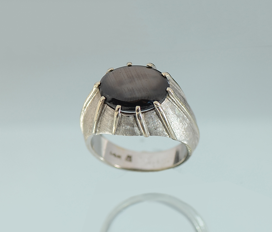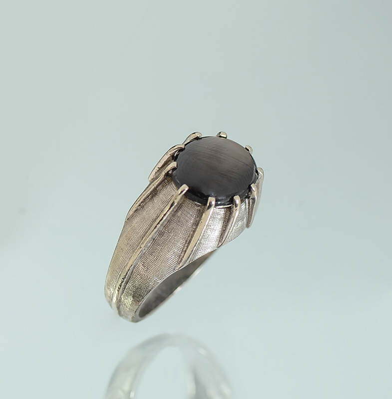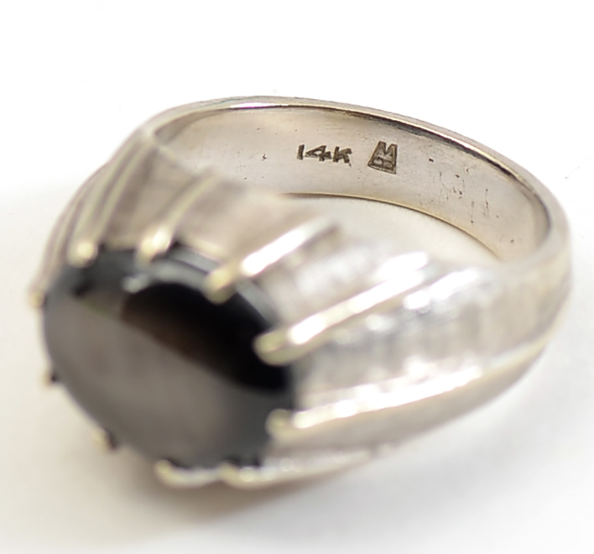 14K BLACK STAR SAPPHIRE RING: 14K white gold ring contains one cabochon cut black star sapphire. Weight: 5.00 Ct. Approx. The sapphire is Belcher prong set. Weight: 7.0 grams. Size: 6