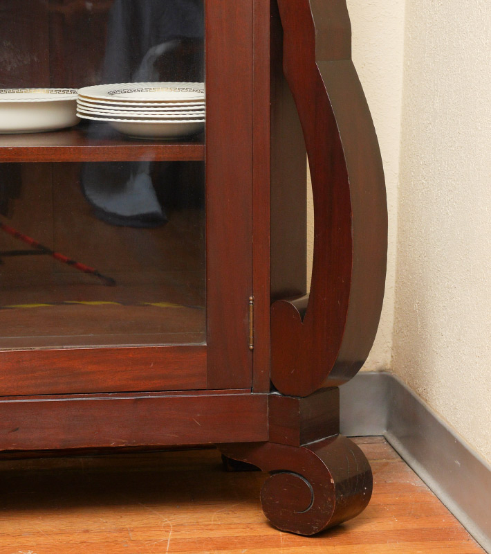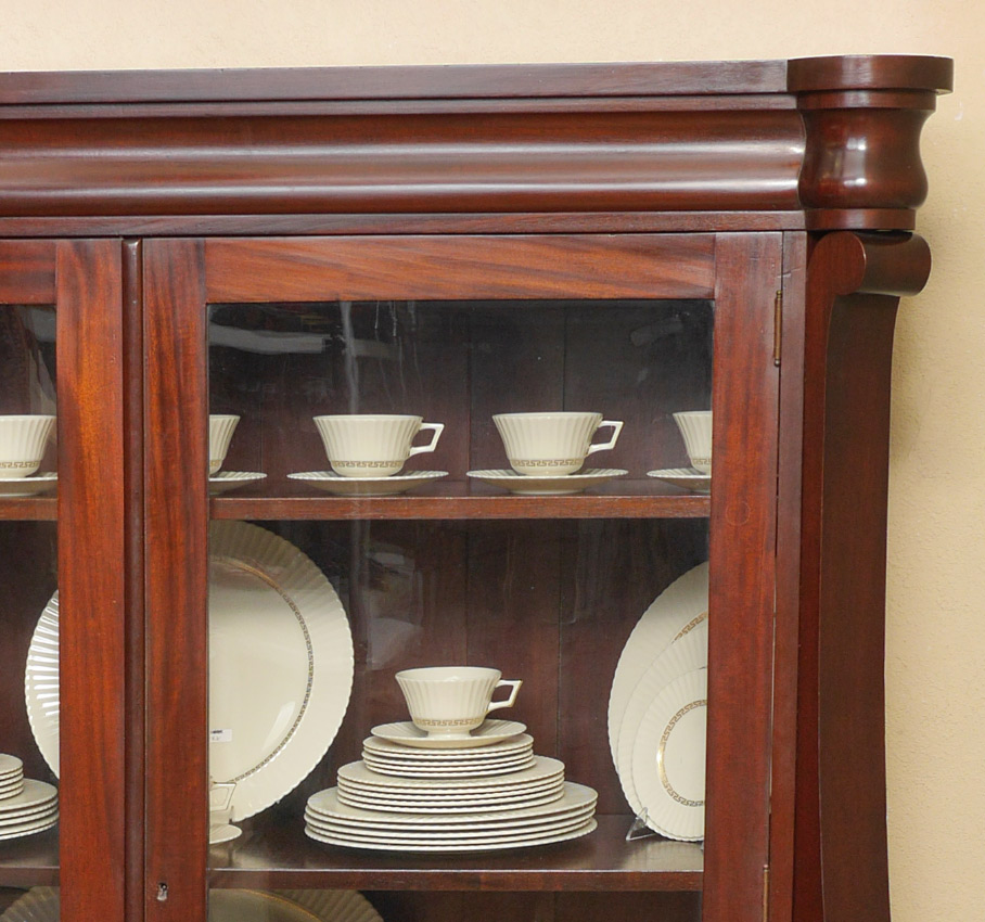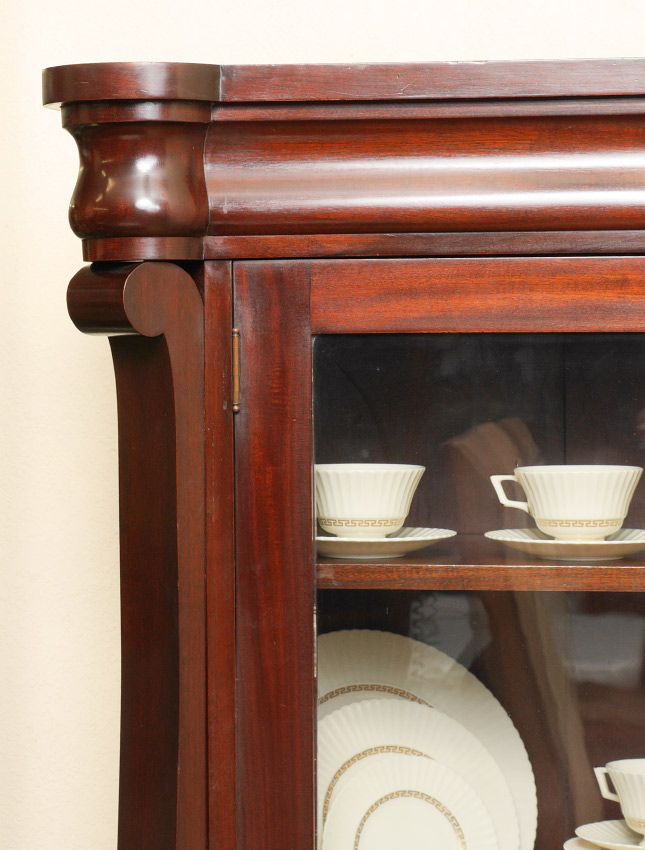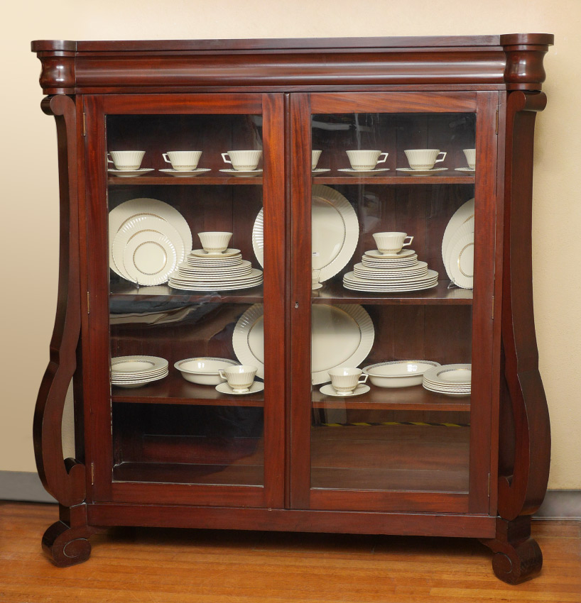 EMPIRE MAHOGANY DOUBLE GLASS DOOR BOOKCASE: Mahogany case, canted corners with bowed wood stiles, double glass doors, 3 wood shelves. 59 1/2'' h. x 57 1/2'' x 17''.