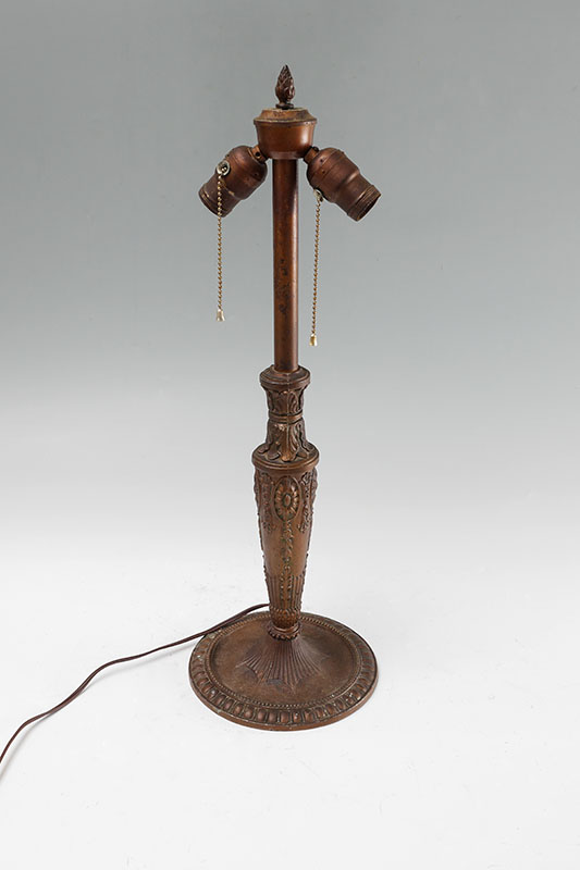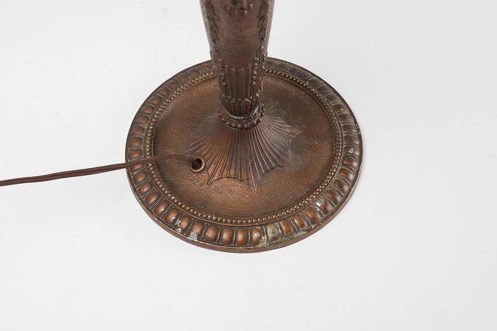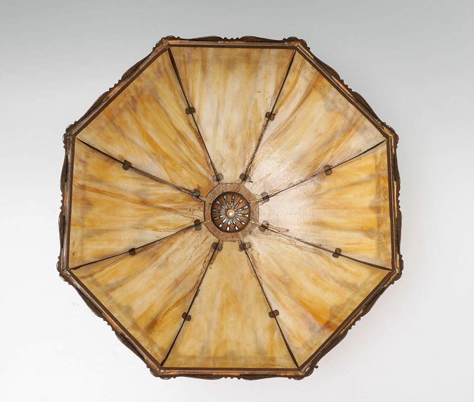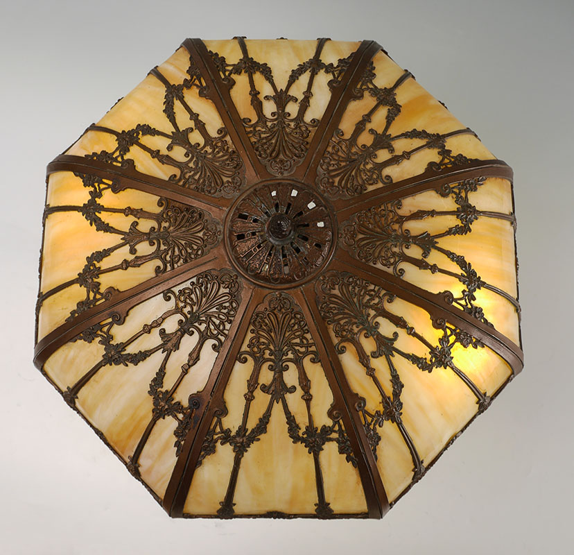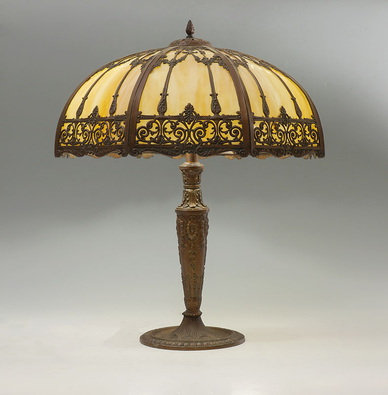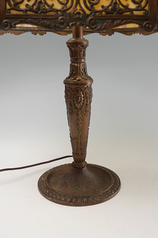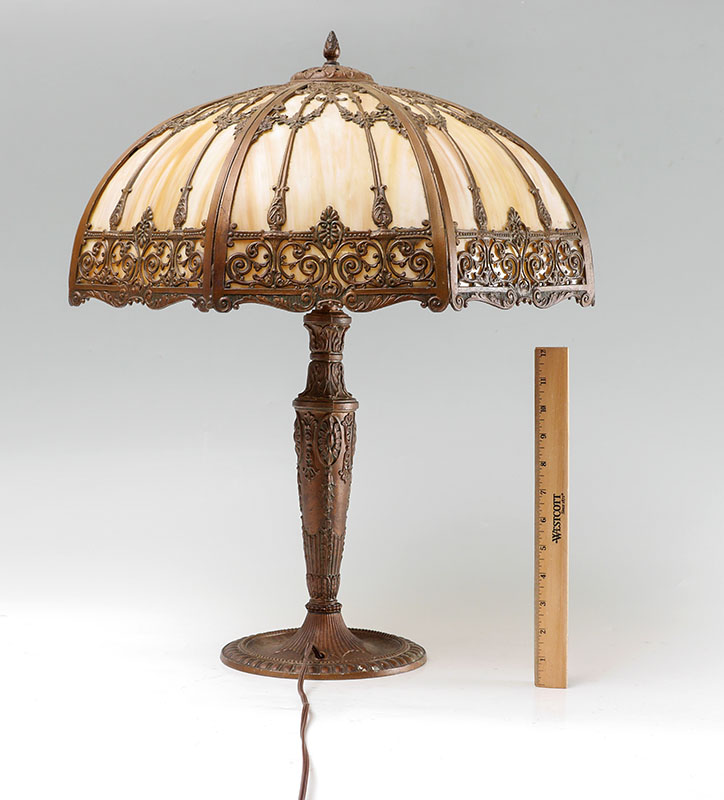 8 BENT PANEL FILIGREE SLAG GLASS LAMP: Unmarked patinated cast metal base with 2 sockets, measures 23'' h. x 8'' dia. Filigree frame 8 bent panel caramel slag shade, 9'' h. x 19 1/4'' dia.