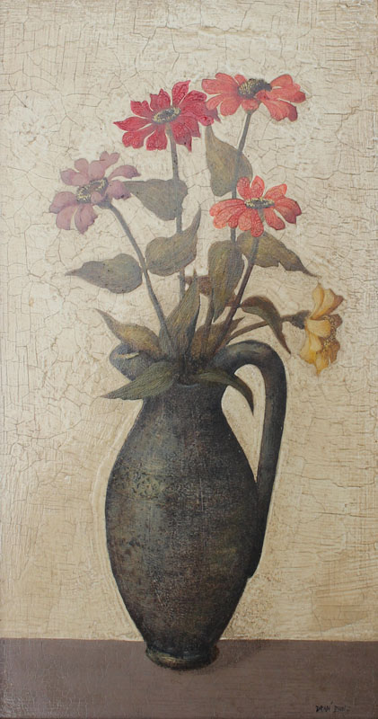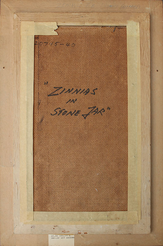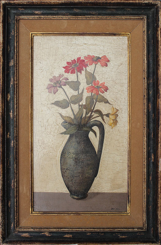BARTH, Bradi, (Swiss, 1922-2007): ''Zinnias in Stone Jar'', Oil/Masonite, 14'' x 8'', signed lower right, titled verso, framed, 18.5'' x 12.25''. Pencil inscription Hammer Galleries verso.