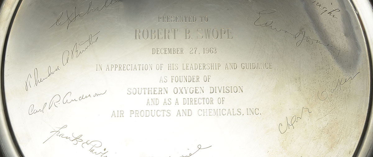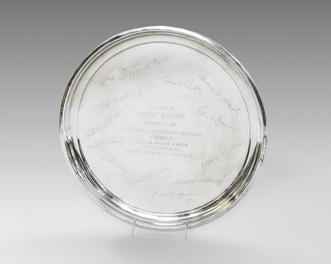 POOLE STERLING PRESENTATION TRAY: 1963 dedication to Robert B Swope, with etched signatures on front of tray. Marked Sterling by Poole, 38. 14 3/8'' dia, approx. 23.5 troy oz.