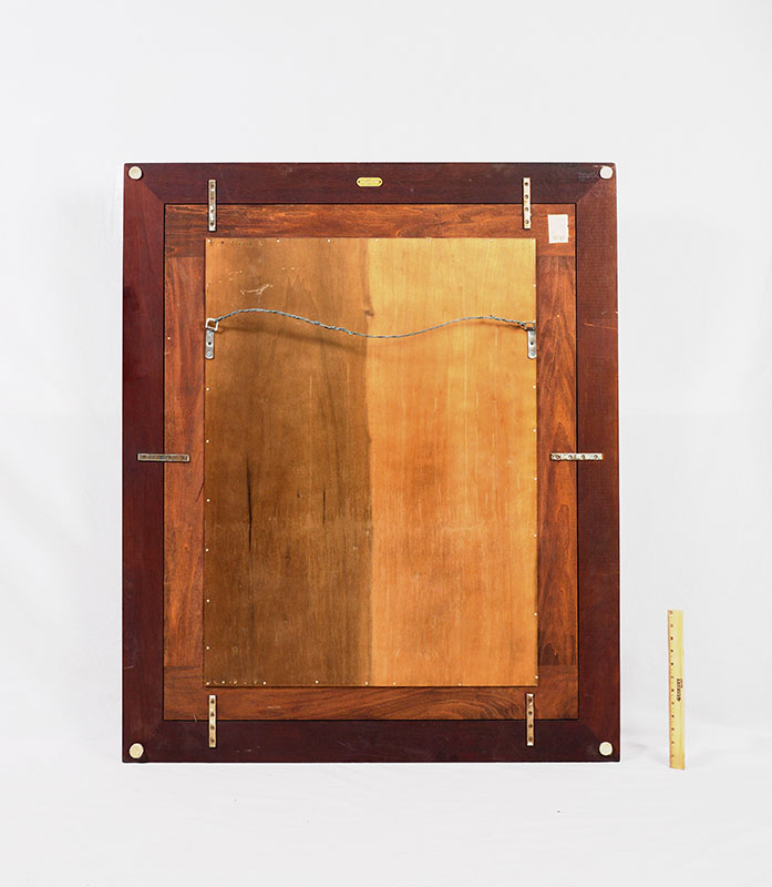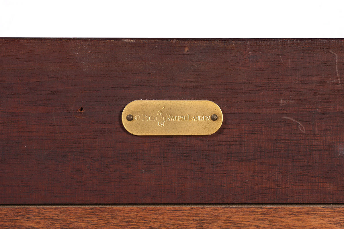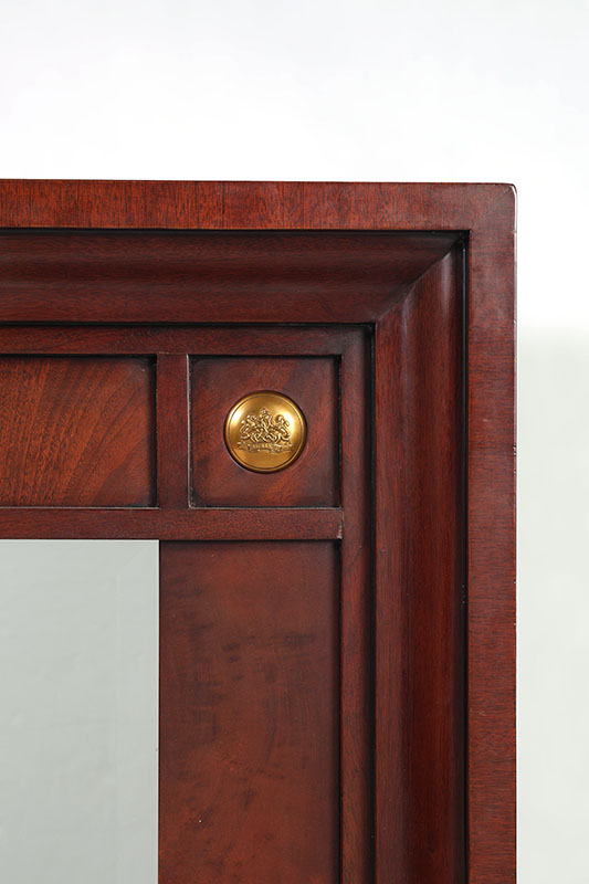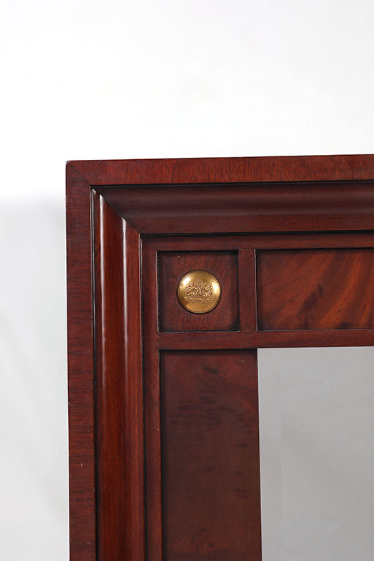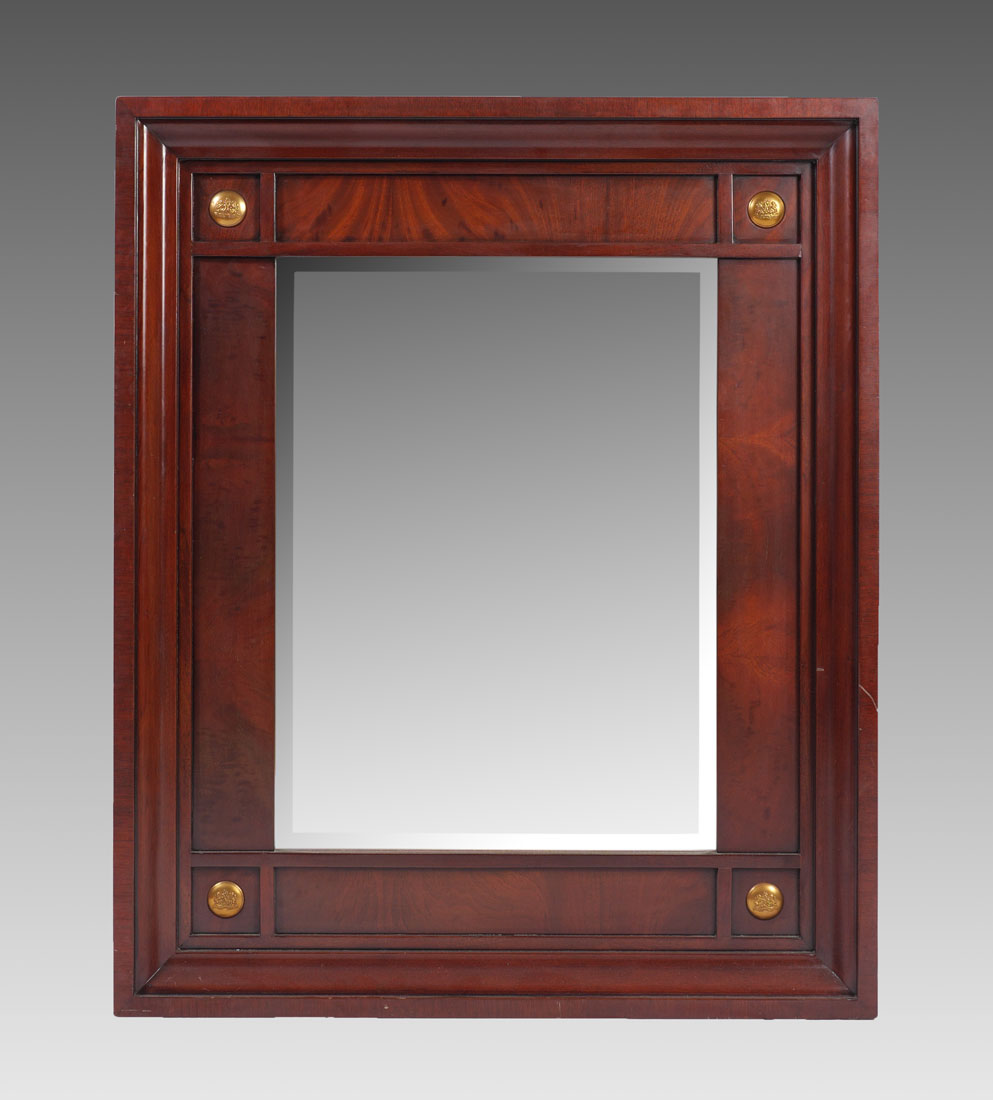 RALPH LAUREN BEVELED GLASS WALL MIRROR: Mahogany frame with brass Ralph Lauren heraldic buttons at inside corners, beveled glass mirror, original label showing $1475 price on back. Overall measures 47'' h. x 39'' x 3 1/4''.
