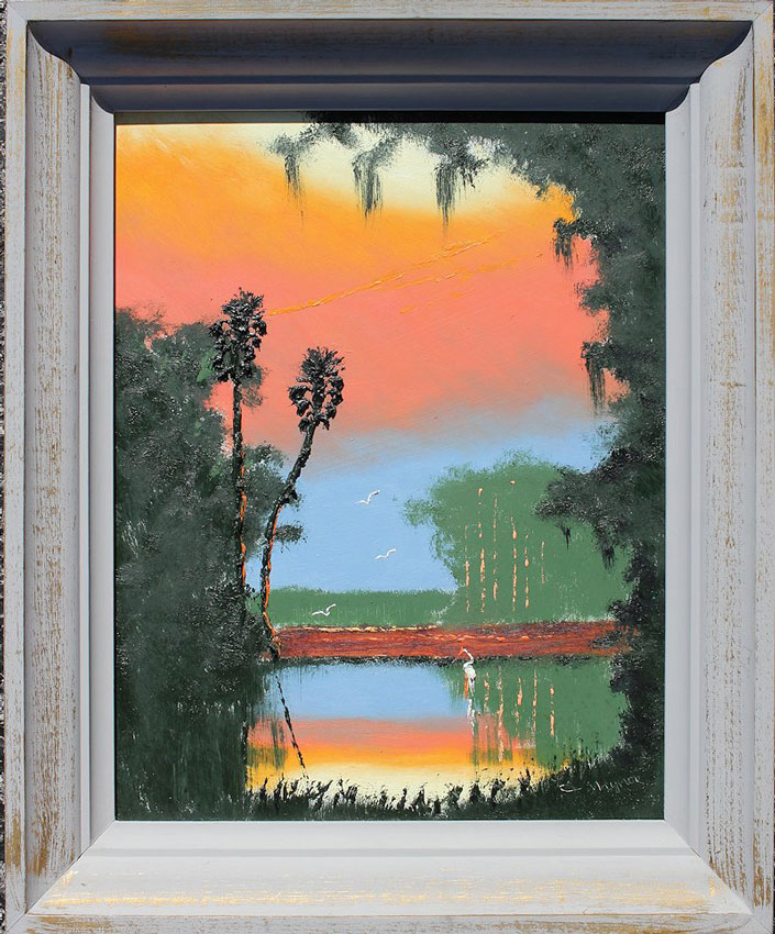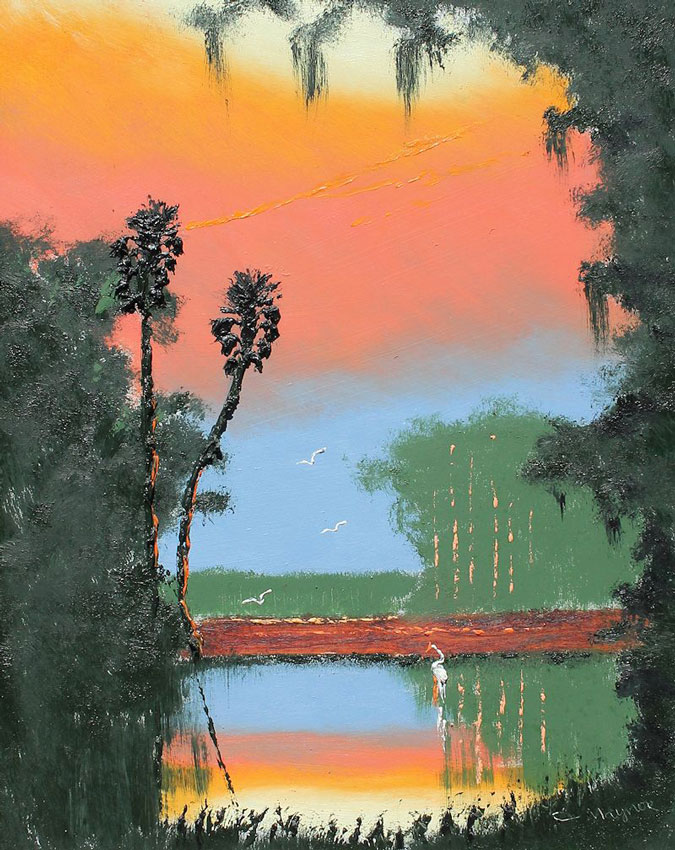 MAYNOR, John, (American, 1948-2016): Florida Highwaymen fire sky sunset river scene, Oil/Masonite, signed lower right and verso, 16'' x 20'', framed 24'' x 20''.