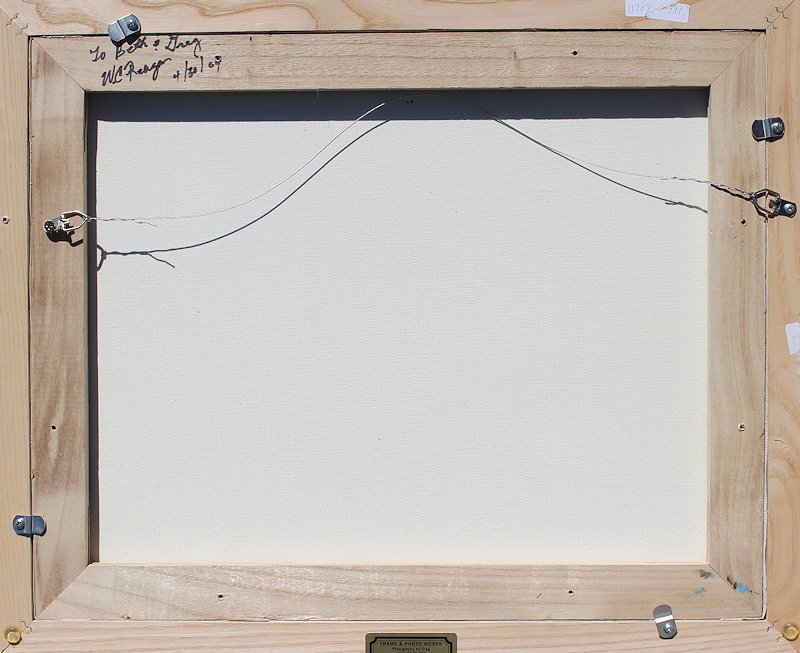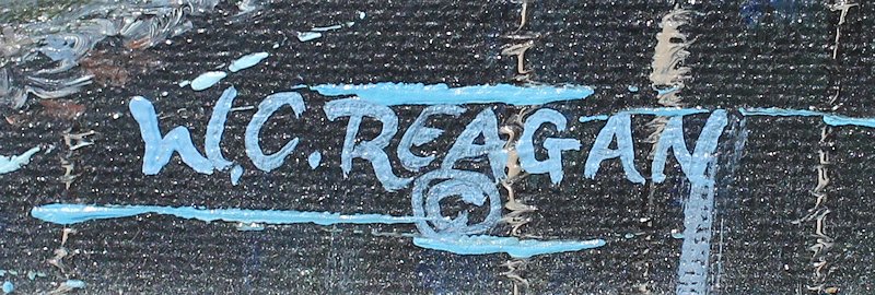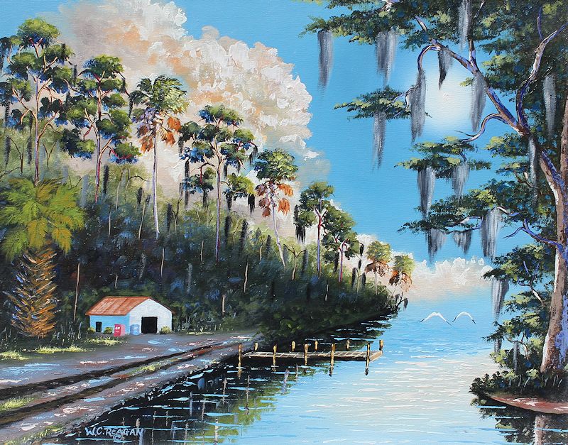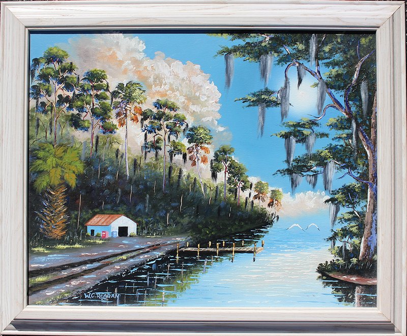 REAGAN, Willie, (American, 20th Century): Florida Highwaymen boat shack and dock on the St. Lucie River, Oil/Canvas, signed lower left, dedicated and dated '04 on back stretcher, 16'' x 20'', framed 19 1/4'' x 23 1/4''.