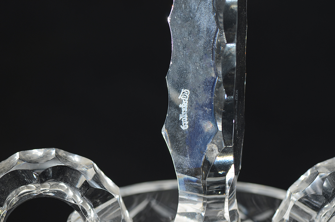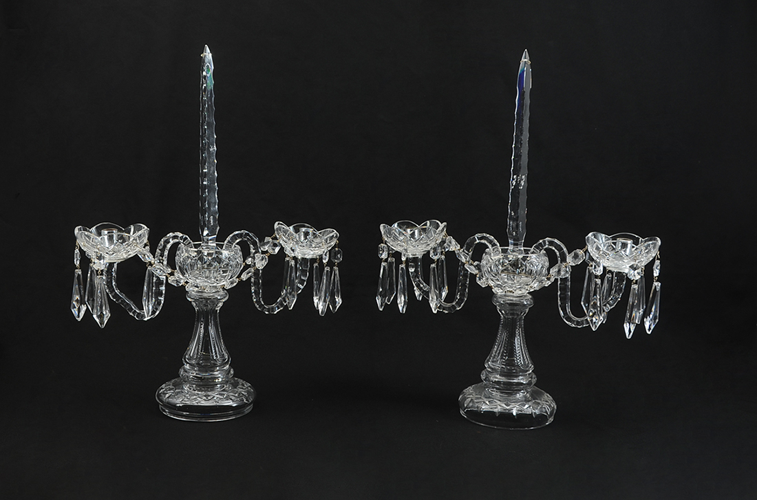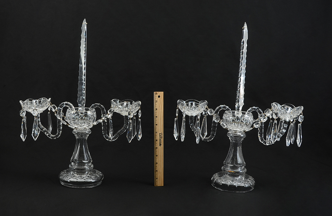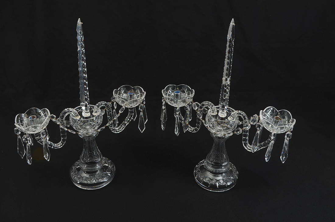 PAIR OF SIGNED WATERFORD CRYSTAL CANDELABRA: Signed on the center spire, 2 arms with cut glass bobeche, prism drops. Overall 21'' h. x 16'' x 6''.