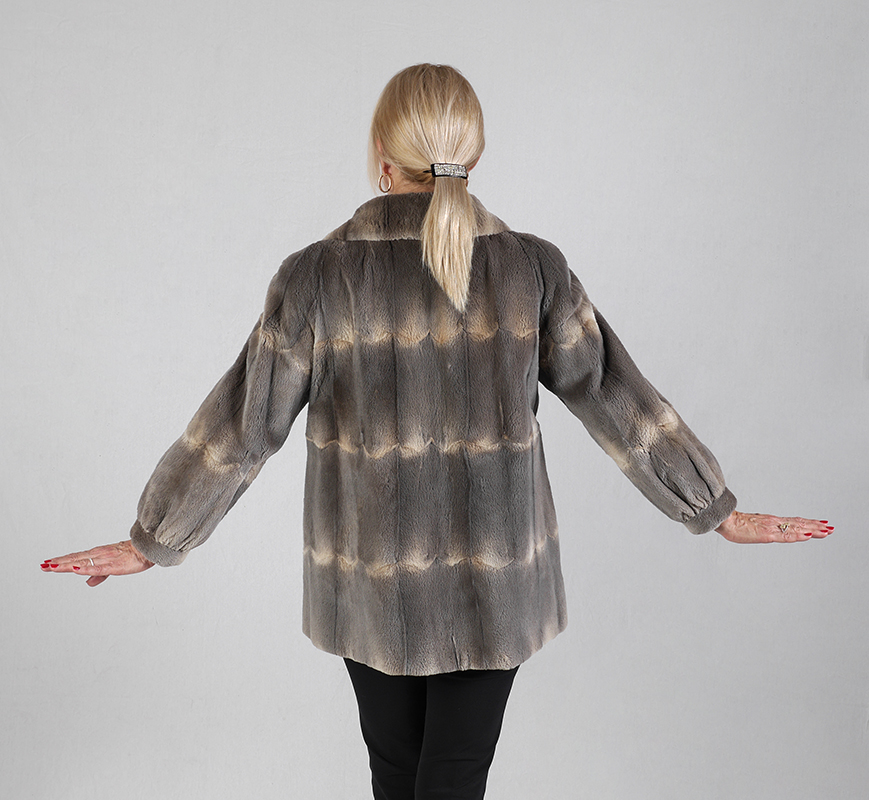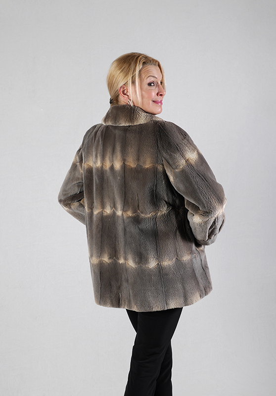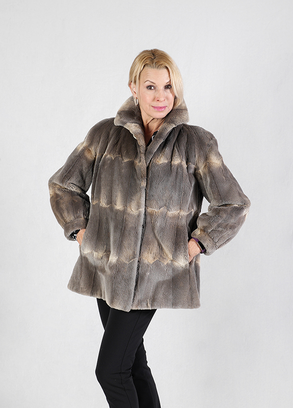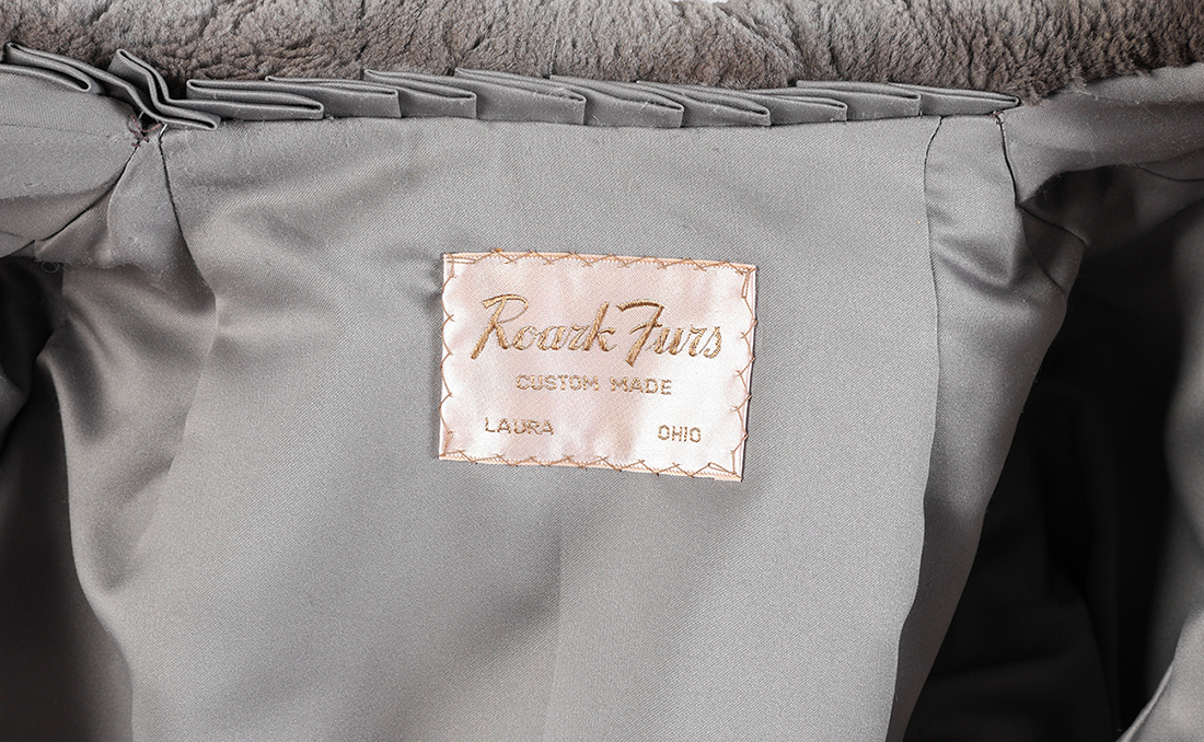 GREY CHINCHILLA SWING COAT: Cleaned and fully lined. Custom made by Roark Furs, Laura OH. Approximate measurements: 27'' from neck to sleeve cuff/hem, 16.5'' across back and 28'' length from neck to hem. Approx size 8-10.