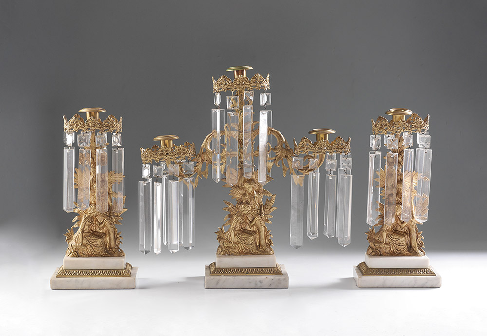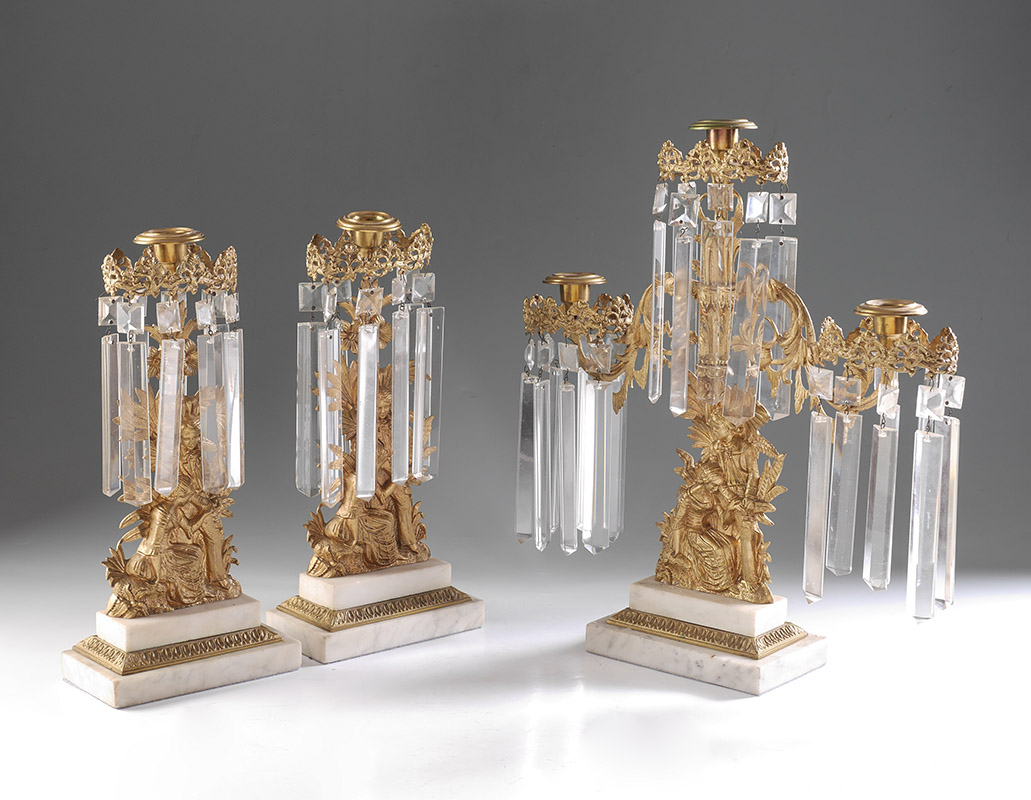 BRASS & CRYSTAL 3 PIECE GIRANDOLE SET: Matched 3 piece set, cast bodies with scene of 2 lovers, crystal prism drops, stepped marble bases. Center 3 light candleholder measures 17 1/4'' h. x 16 1/2'' x 4 1/4''.