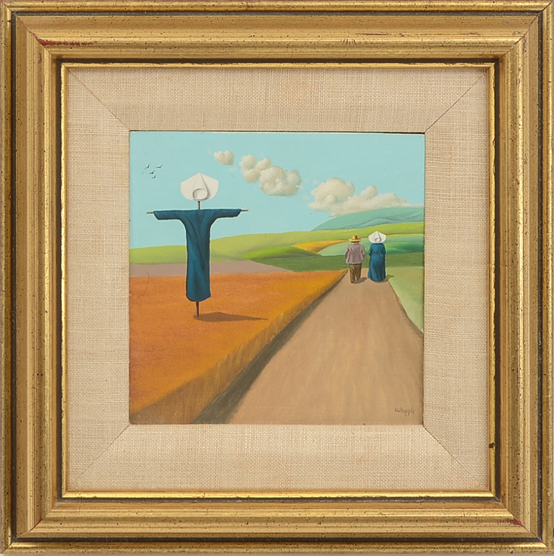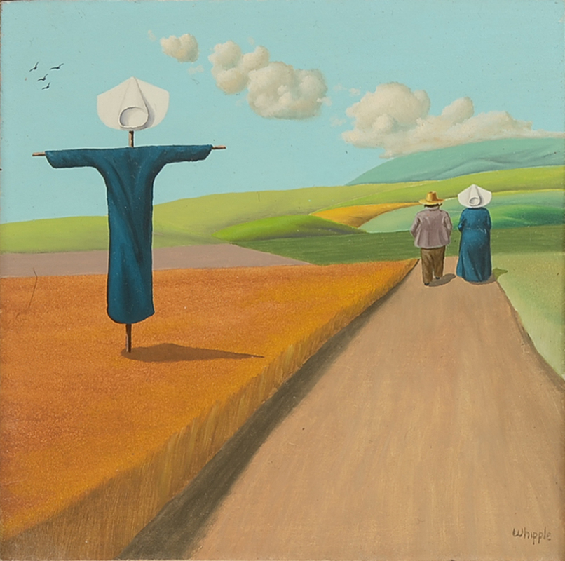 WHIPPLE, Frank, (American, -2016): Nun walking along a road, scarecrow nun looking on, 5'' x 5'', signed lower right, framed, 9.5'' x 9.5''.