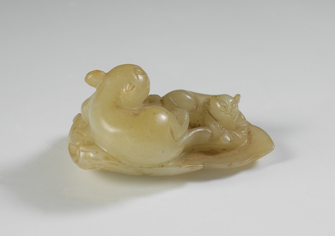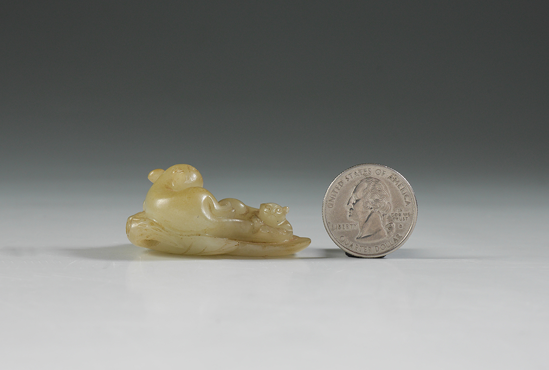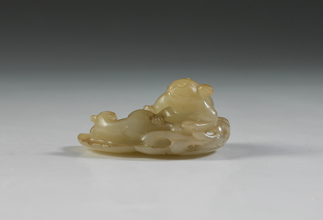 CHINESE CARVED JADE FIGURAL CATS NETSUKE: Reticulated carved jade or similar stone netsuke with 2 figural cats. No visible signature, measures 3/4'' h. x 1 1/2'' x 3/4''.