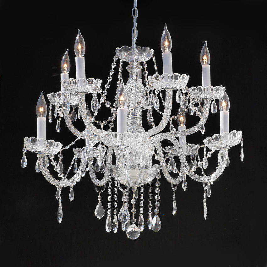 10 LIGHT CRYSTAL CHANDELIER: Contemporary 10 light chandelier with crystal prisms, swags and drops. Overall measures approx. 23'' h. x 25'' dia.