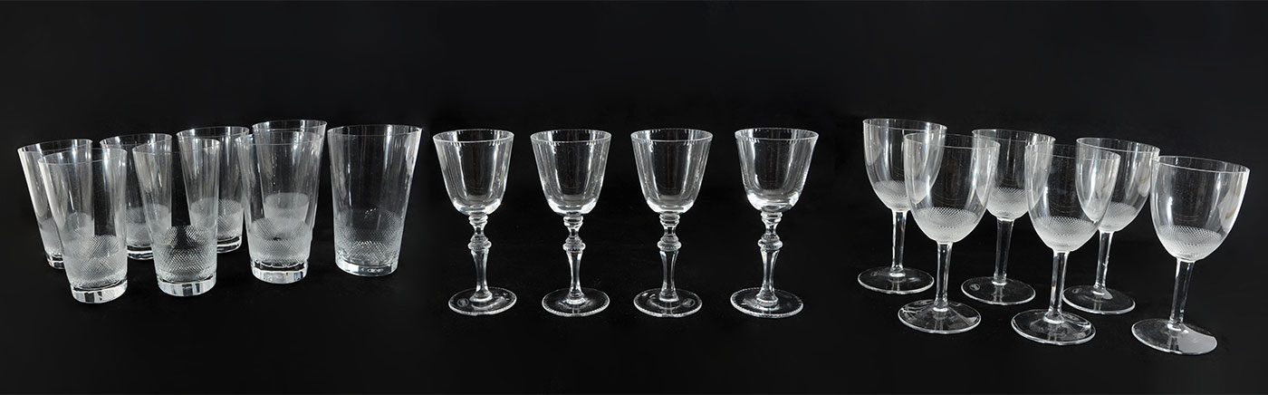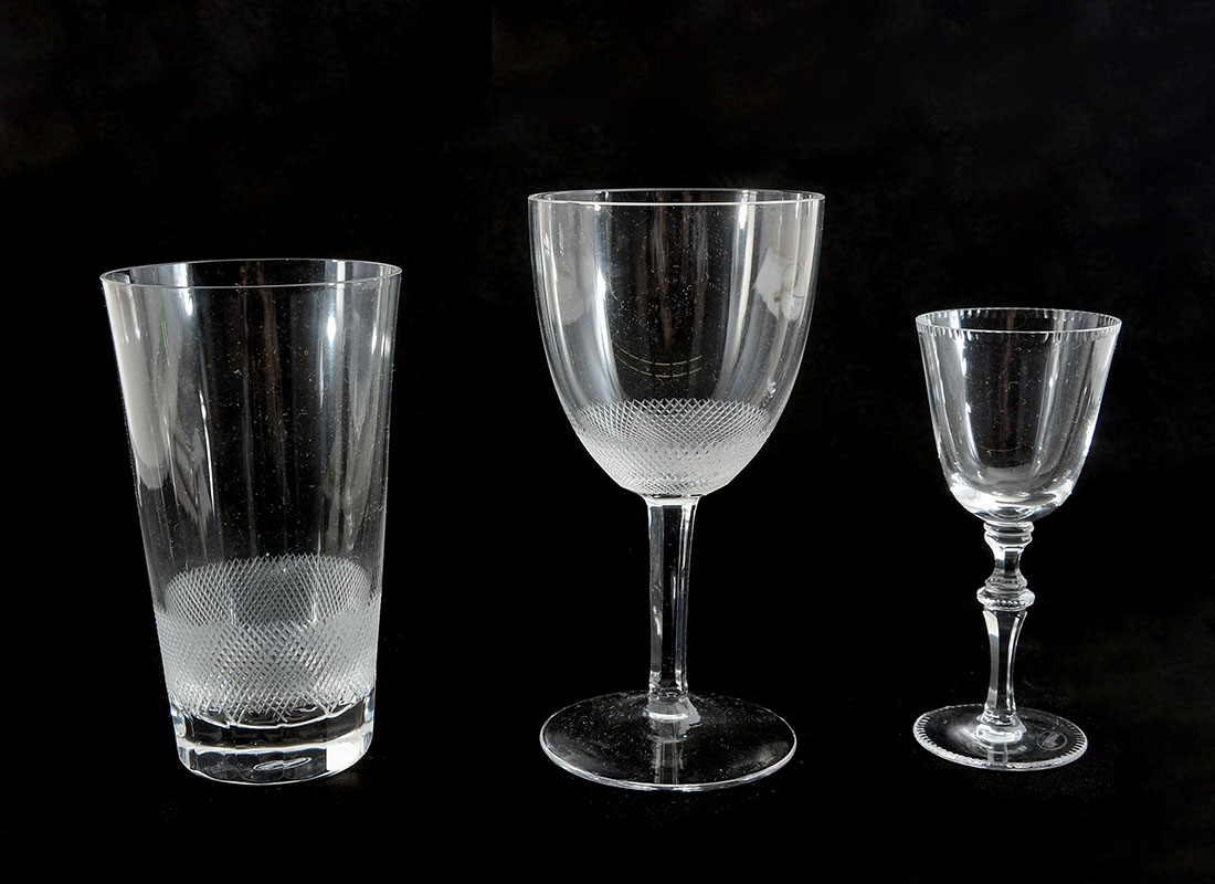 18 PIECE MOSER ROYAL & MOZART STEMWARE: 18 pieces total to include in the Royal pattern 6 wine glasses (6'') and 8 tumblers (5 3/4''). 4 cordials (4 5/8'') in the Mozart pattern.