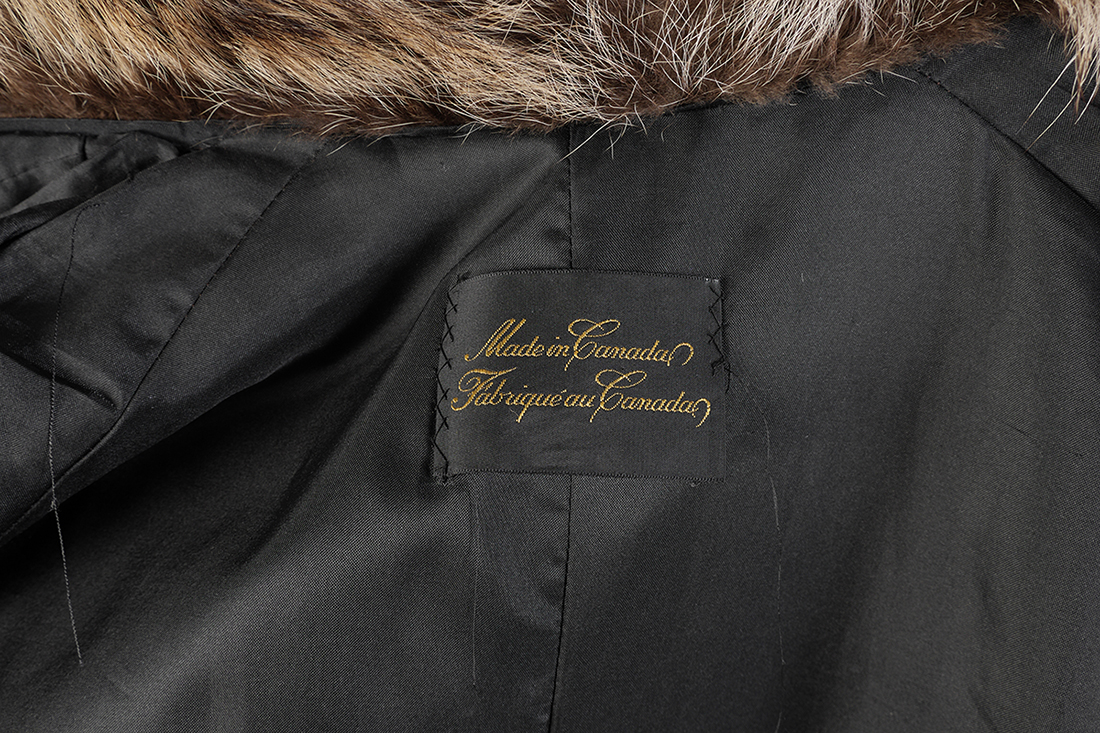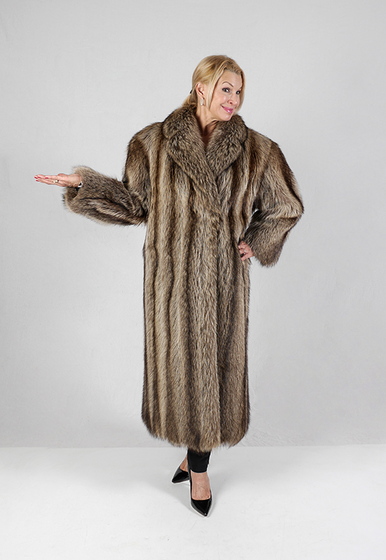 FLOOR-LENGTH RACOON COAT: Fully lined, cleaned and glazed. Made in Canada label. Approximate measurements: 28'' from neck to sleeve cuff/hem, 17'' across back and 49'' length from neck to hem. Approx size 10.