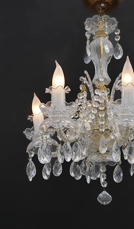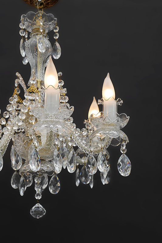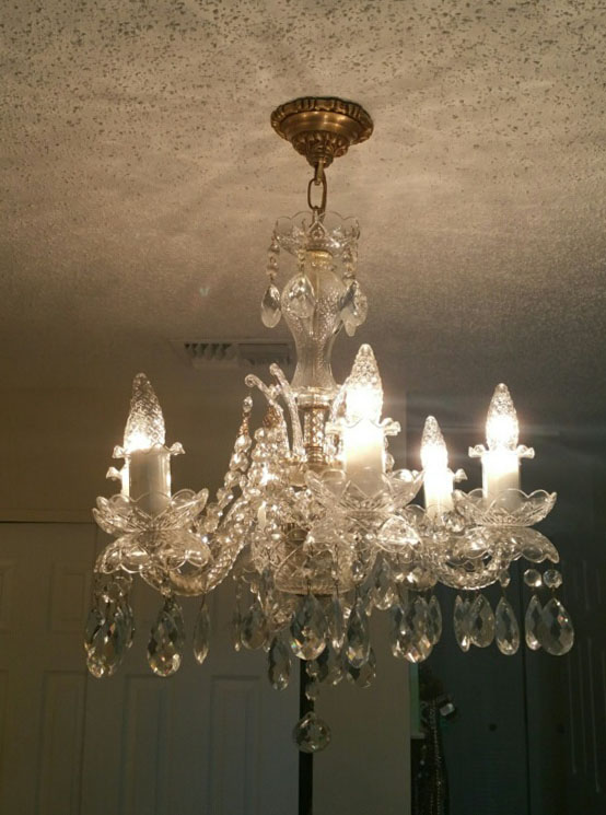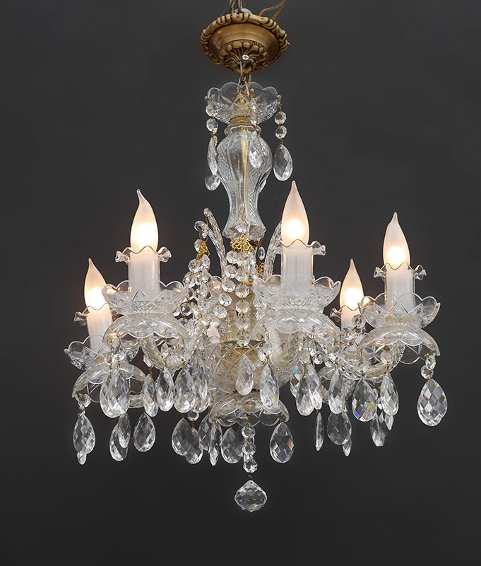 6 LIGHT CRYSTAL CHANDELIER: 6 spiral twist crystal arms, crystal prisms, swags and drops, brass accents. Overall approx. 19'' h. x 19'' dia.