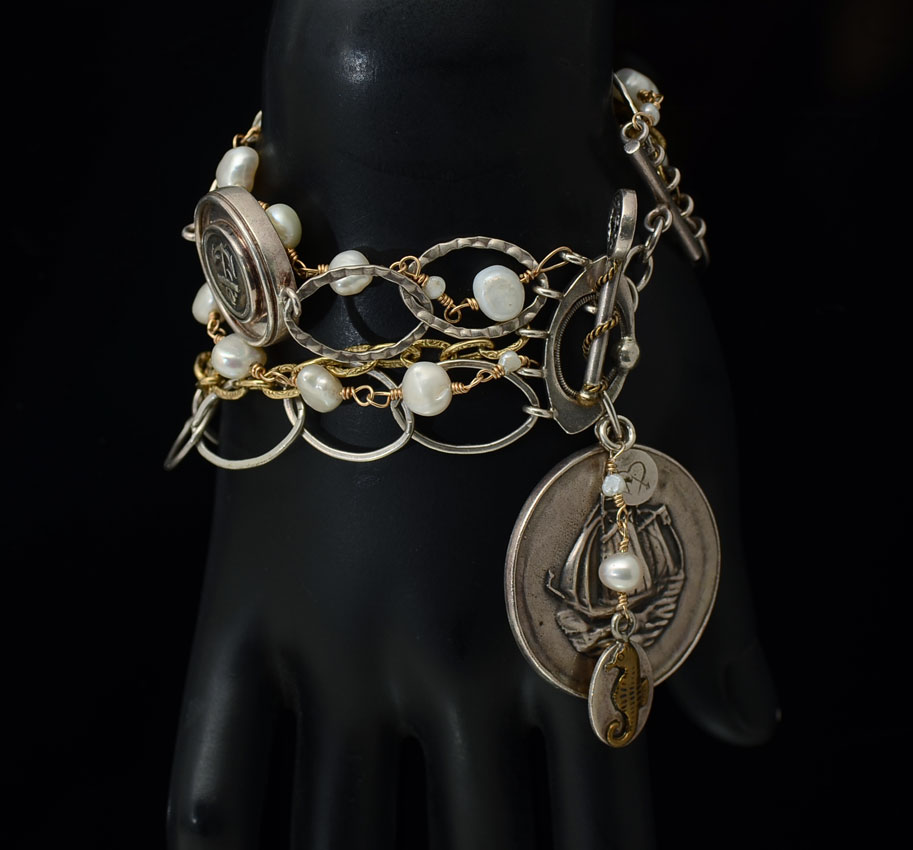 ''ECHO OF THE DREAMER'' IN STERLING SILVER WITH FRESH WATER PEARL BRACELET: 5 strands of nautical themed design in this appealing sterling silver and pearl bracelet. Total weight 2.190 Troy ounces.