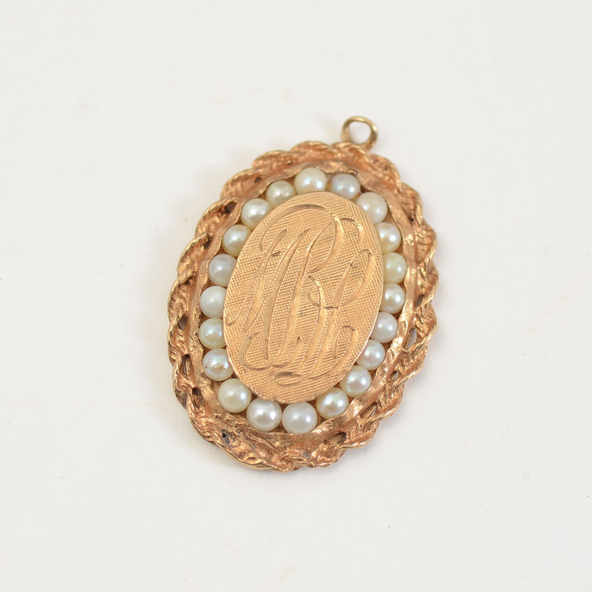 ANTIQUE 14K OVAL PENDANT WITH SEED PEARLS: Sweet pendant with the initials MBL. Stamped 14K and makers mark. Seed pearls encircle the initialed center. Total weight 7.0 grams.