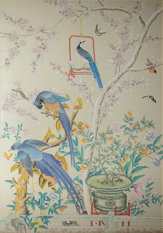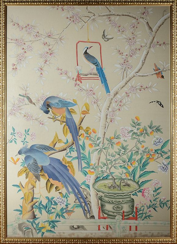 LARGE MOTIF WATERCOLOR/SILK PAINTING: Scene depicts birds and butterflies in natural habitat, overall measurements with frame, 58'' x 43''. Possibly Chelsea House.