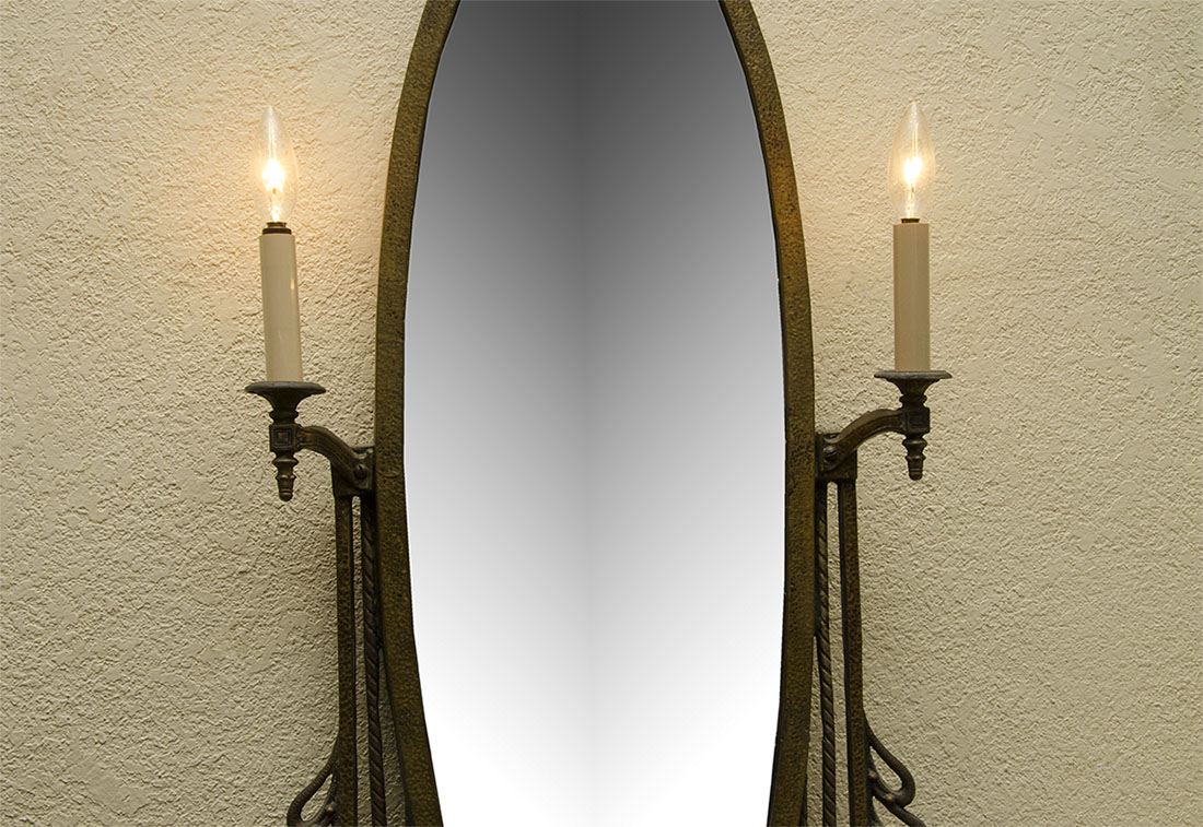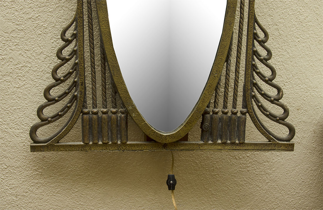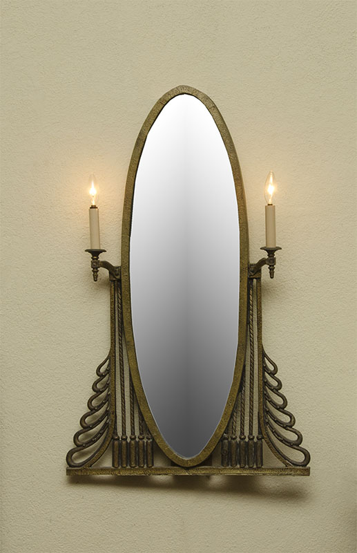 AFTER OSCAR BACH LIGHTED DECO WALL MIRROR: Cast brass deco style wall mirror with flared base, loop and hanging rope tassel motif. Electric light either side of oval mirror. Overall 35'' h. x 22'' x 2 1/2''.