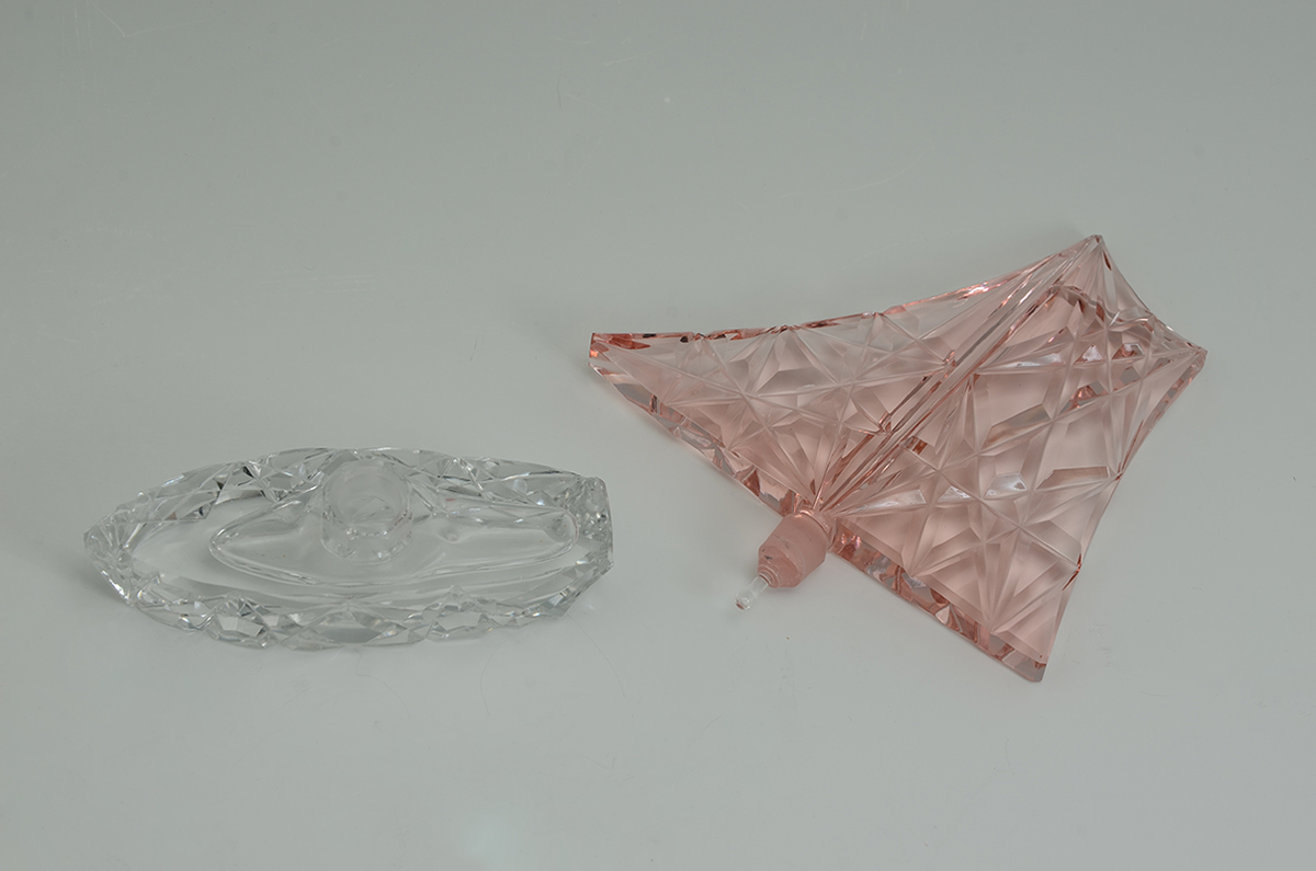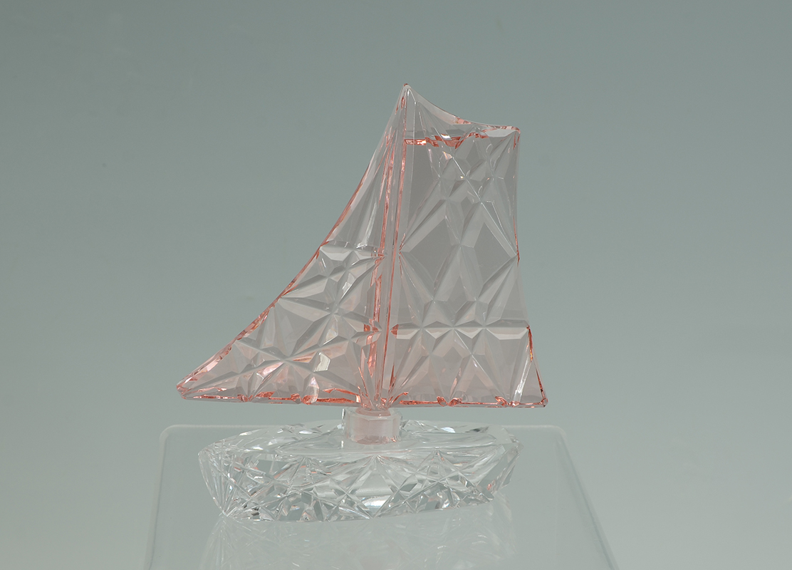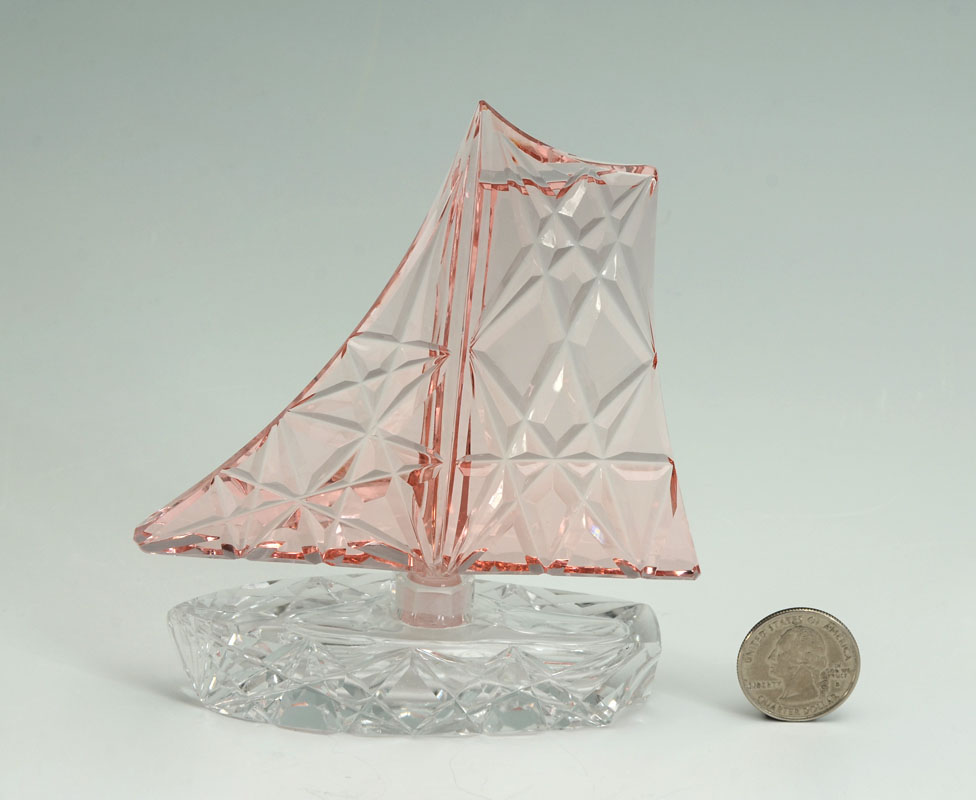 CRYSTAL FIGURAL SAILBOAT PERFUME BOTTLE: Clear cut crystal boat form base with pink cut crystal sail stopper/dabber. No makers mark of label. Overall with stopper 4 7/8'' h. x 4 1/4''.