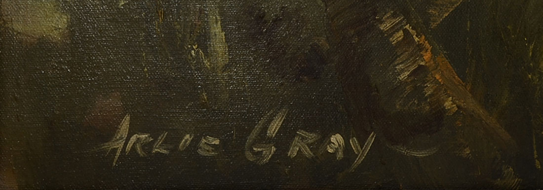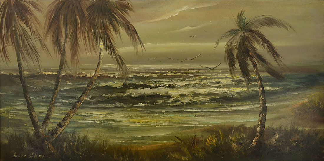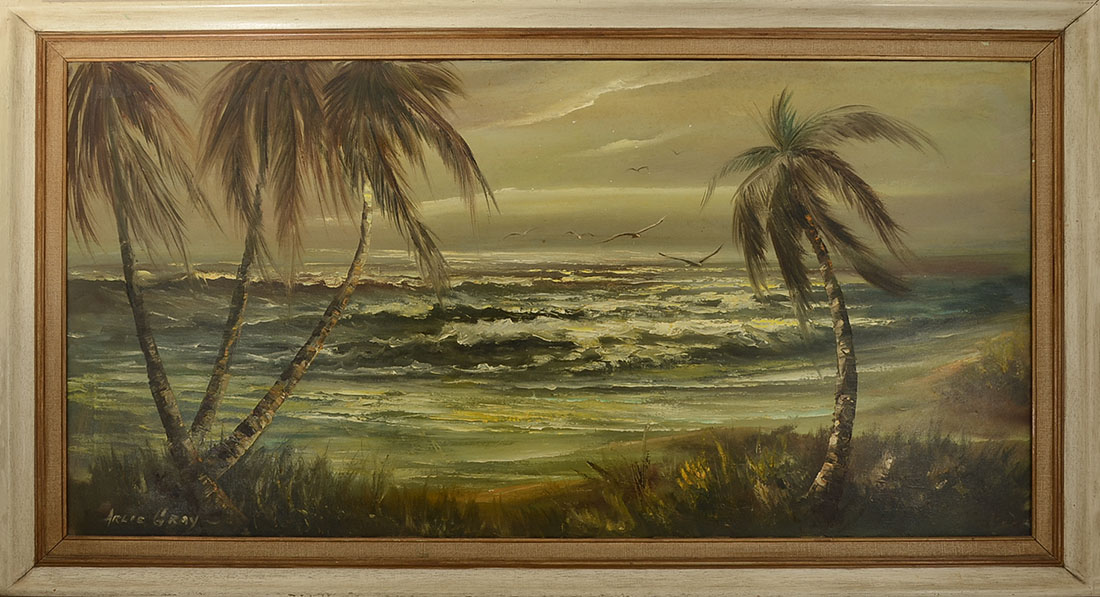 GRAY, Arlie, (American, 20th Century): Florida coastal stormy beachfront scene with palm trees, birds and crashing surf, Oil/Canvas, signed lower left, 24'' x 48'', framed 29 1/2'' x 53 1/2''. Gray typically painted in and around the Sarasota area.