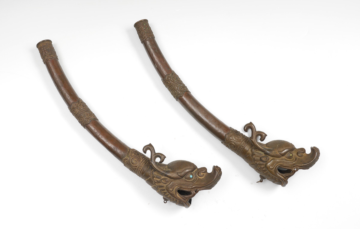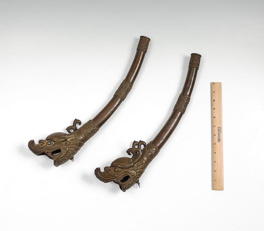 PAIR TIBETAN FIGURAL TEMPLE HORNS: Each with figural serpent or dragon head, hand hammered copper body. One with blue stone eyes, the other with green. Measures 18'' long, actual age unknown.