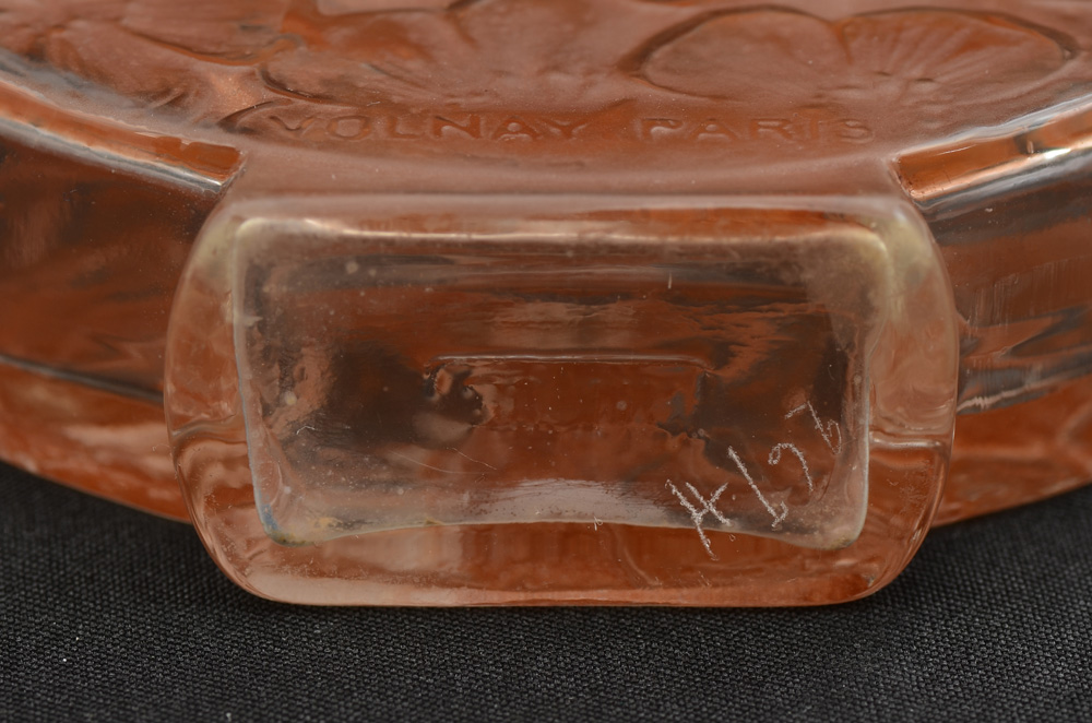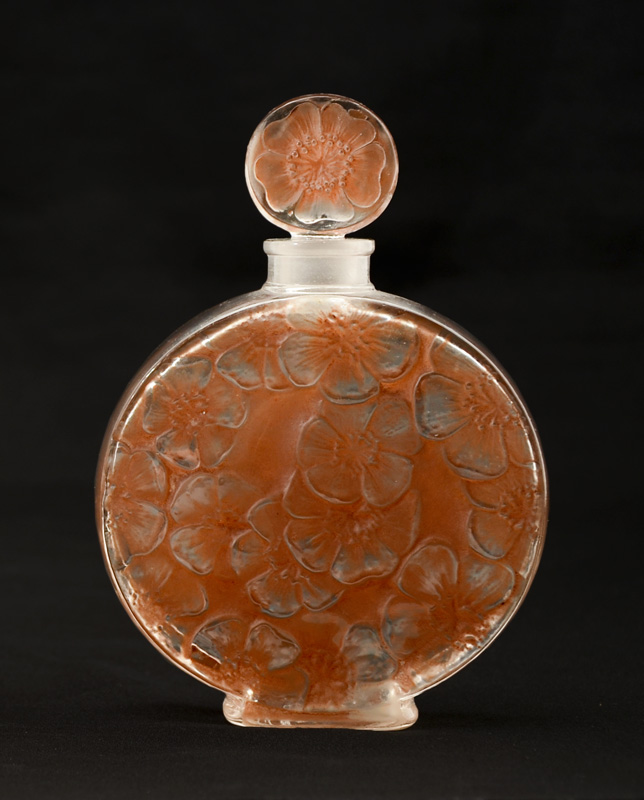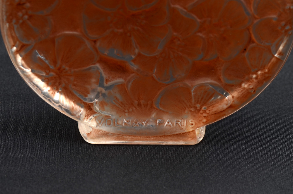 R. LALIQUE VOLNAY CHYPRE AMBRE PERFUME BOTTLE: Circa 1920's, floral motif perfume bottle with Molded Lalique signature on base, Volnay France near base, etched 247H on base, 247 bottom of stopper. Floral motif on both sides with sepia toning. Overall measures 4 7/8'' h. x 3 1/2'' x 1''.