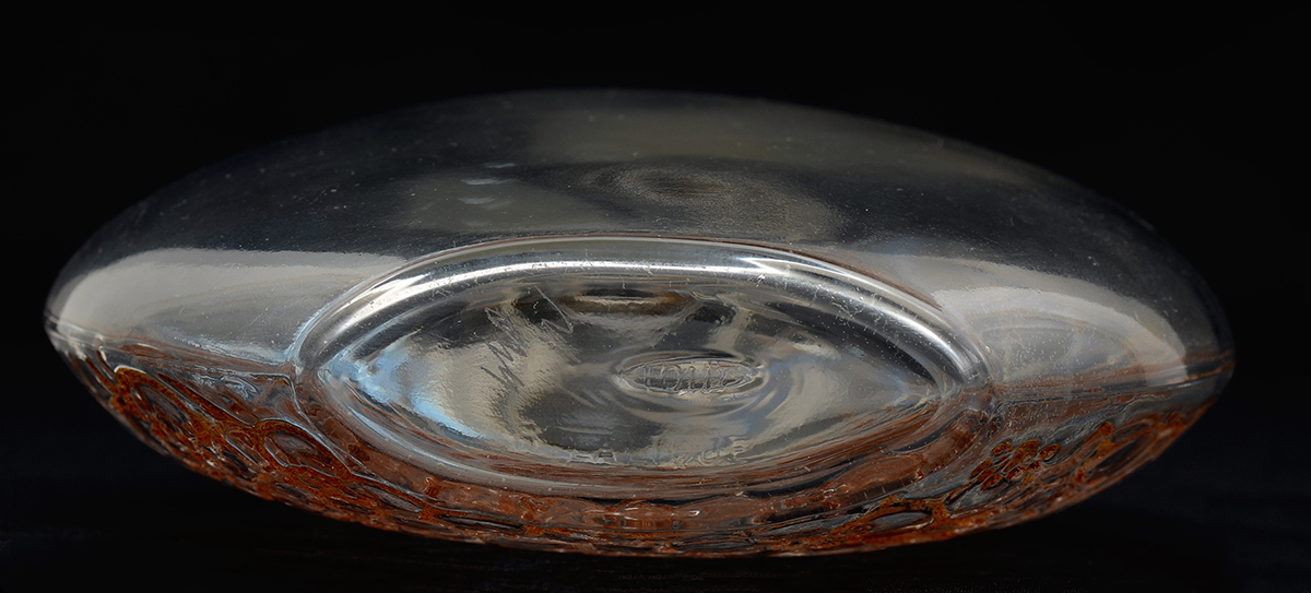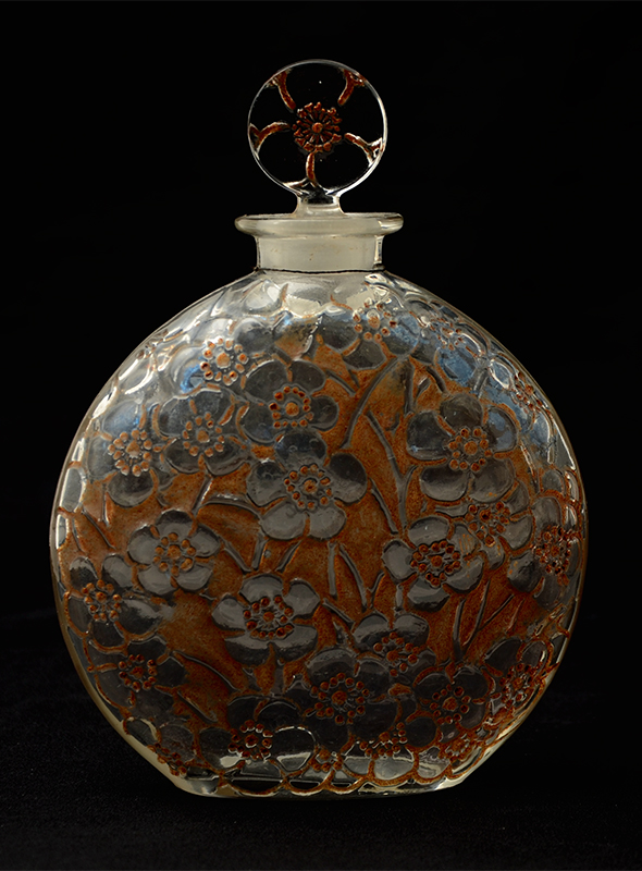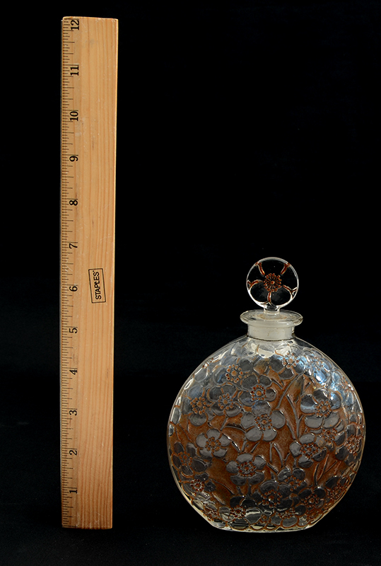 R. LALIQUE LE LYS FOR D'ORSAY PERFUME BOTTLE: Circa 1920's, floral pattern on one side with sepia accents, molded R. Lalique mark with additional ''Loue'' in center of base, etched 440 12 on base and stopper. Overall measures 6 3/4'' h. x 5''.
