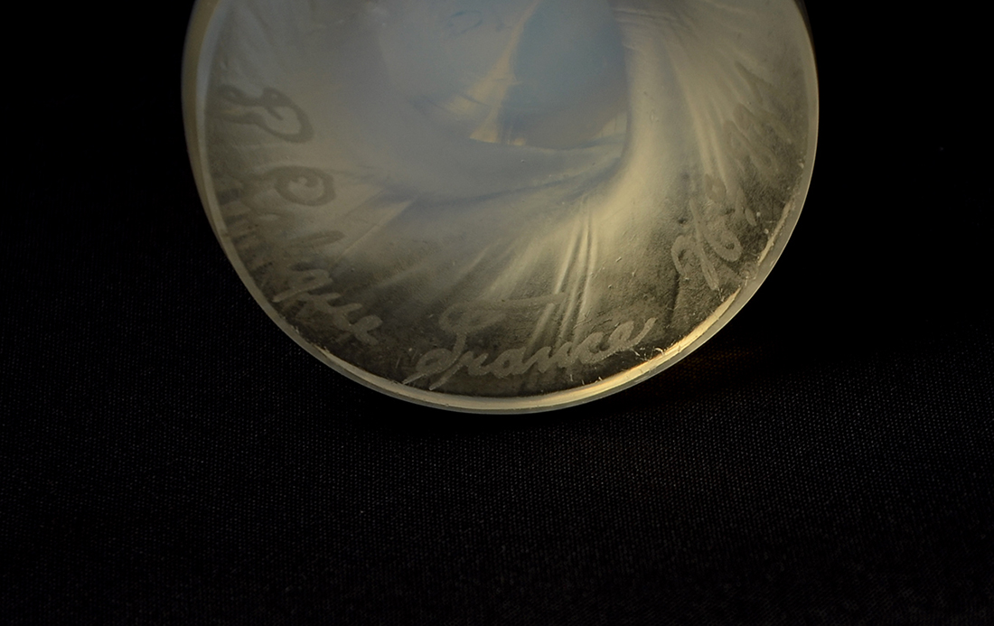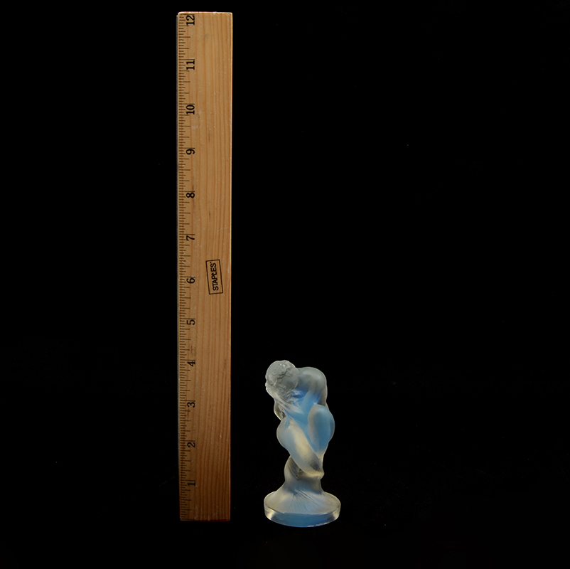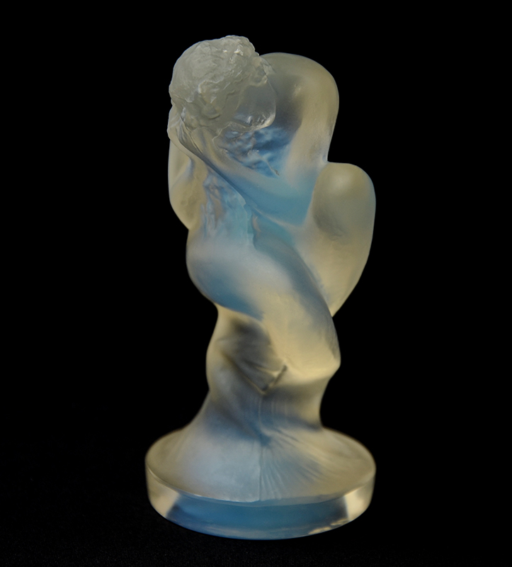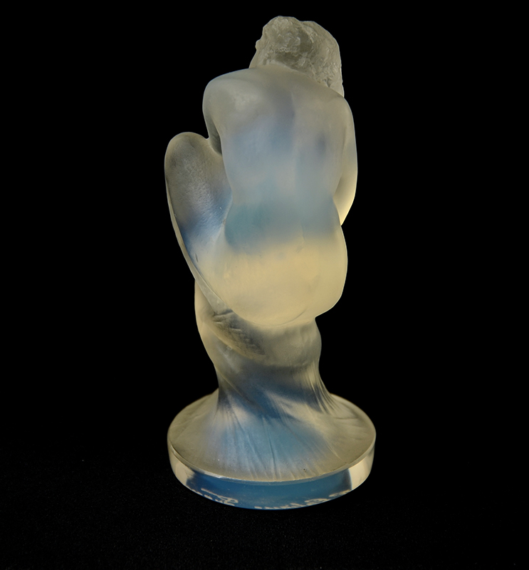 RENE LALIQUE SIRENE OPALESCENT CAR MASCOT: Circa 1920's, slight opalescence, figure of a Siren, etched signature on base R. Lalique France No. 831. Measures 4'' h. x 2'' dia.