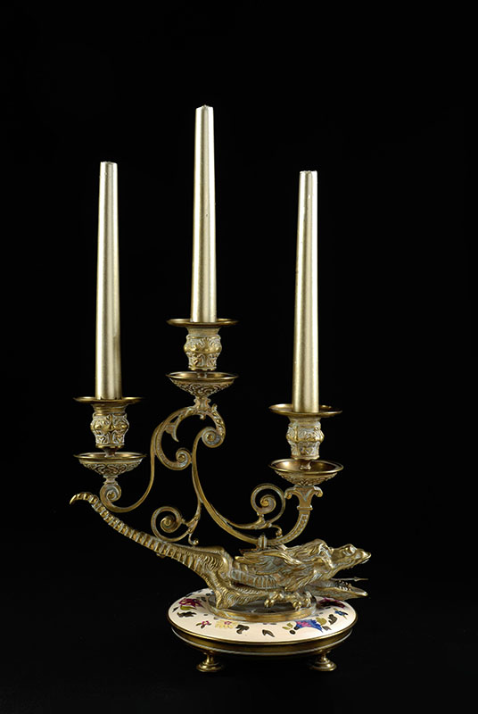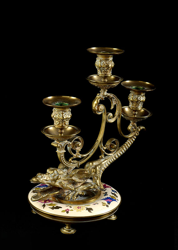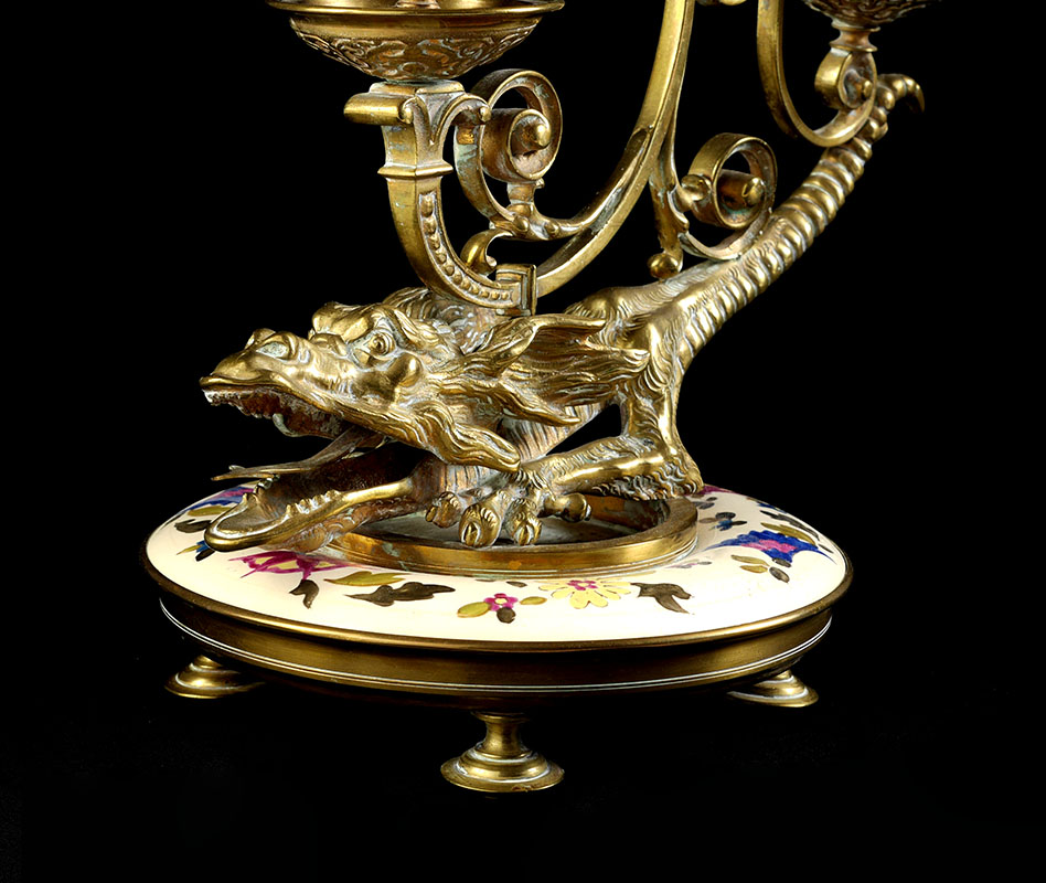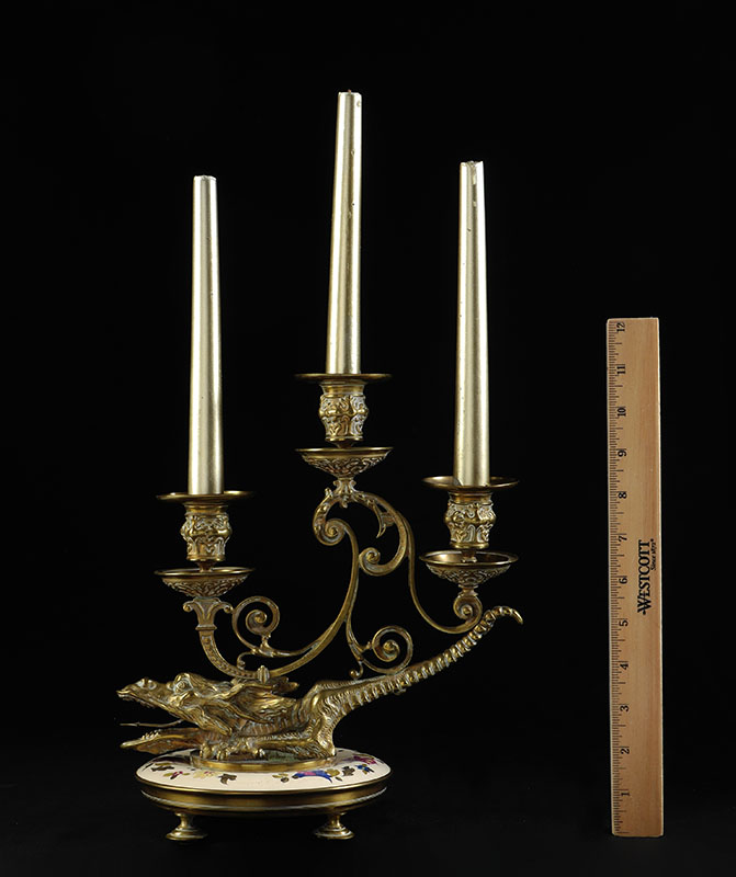 BRONZE ENAMELED DRAGON 3 LIGHT CANDLEHOLDER: Continental 3 light foliate scroll lights sit on back of figural dragon, base with hand painted enamel ring above 4 feet. Overall measures 11'' h. x 10 1/4'' x 6 1/4''.