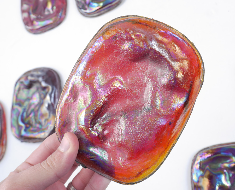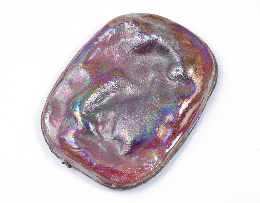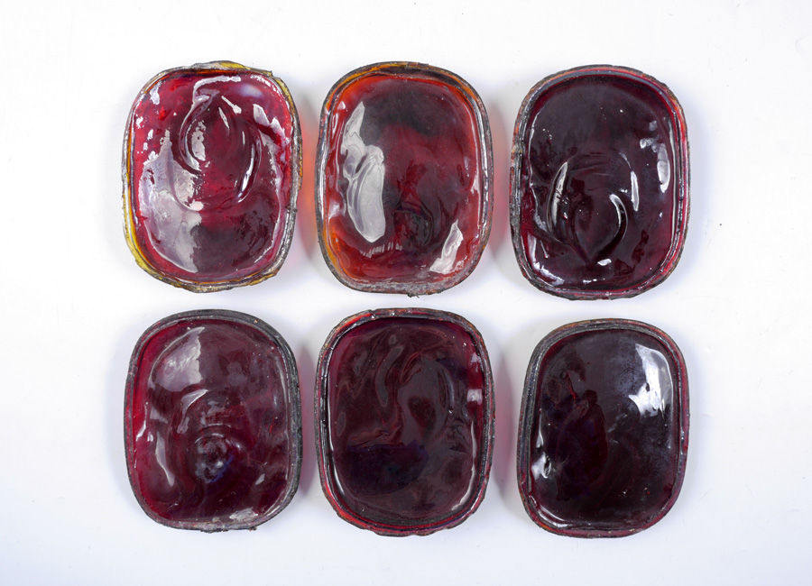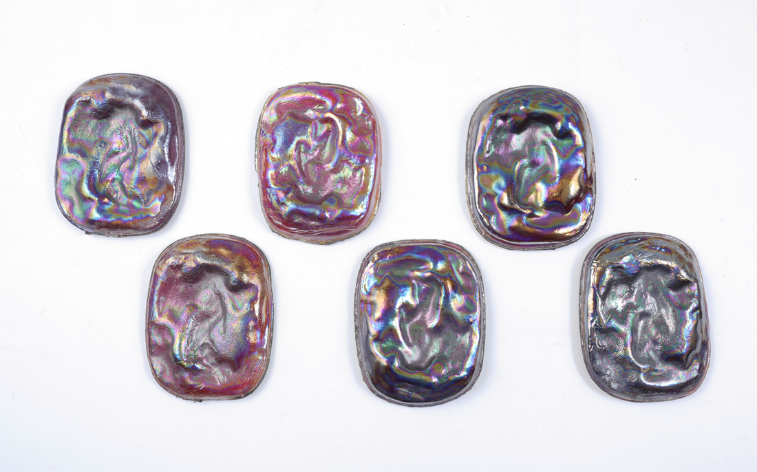 6 PIECE TIFFANY RED TURTLE BACK GLASS TILES: Iridescent red color, unsigned, most likely from a lamp or chandelier, each measuring approx. 5 3/4'' x 4 3/4'' x 1''.