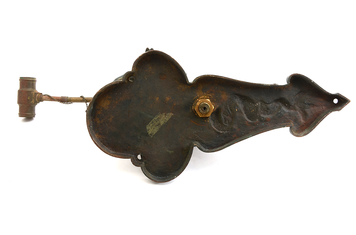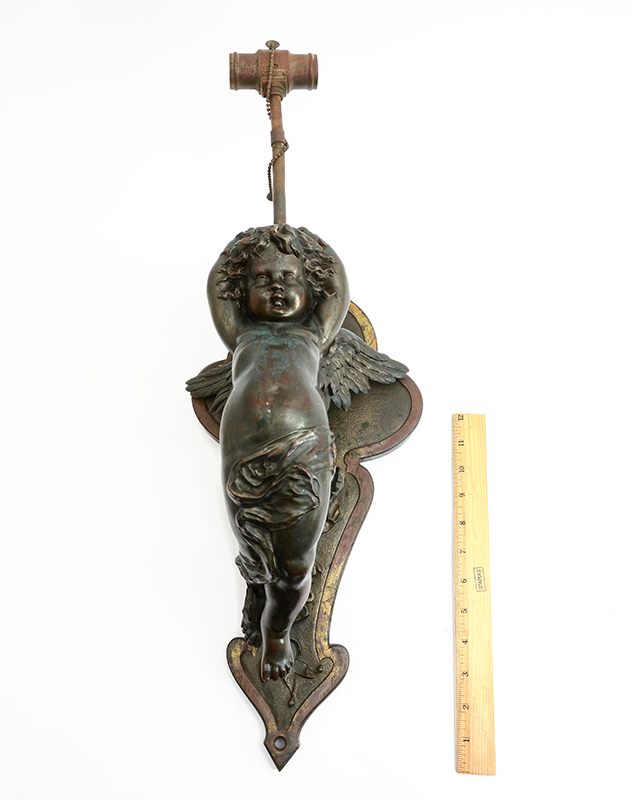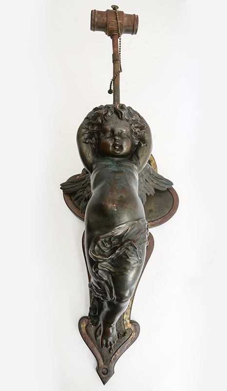 19TH CENTURY BRONZE FIGURAL CHERUB WALL SCONCE: Bronze figure of a winged cherub, shaped wall mount with garland, electrified with 2 socket fixture. No visible signature, overall 24 1/4'' x 8 1/2'' x 8 1/2''.