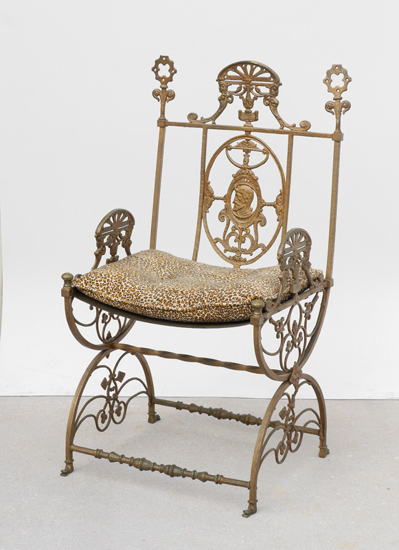 ATTRIB. OSCAR BACH BRONZE & IRON SIDE CHAIR: Attributed to Oscar Bach, top rail with curved fan supported by figural female busts, finial either side, back center medallion with male bust. Arm rests match top rail, foliate scroll sides, wrought iron stretcher, metal seat with leopard print cushion. Overall measures 38 1/4'' h. x 20 1/2'' x 19''. See the similar, but not identical, chair next lot.