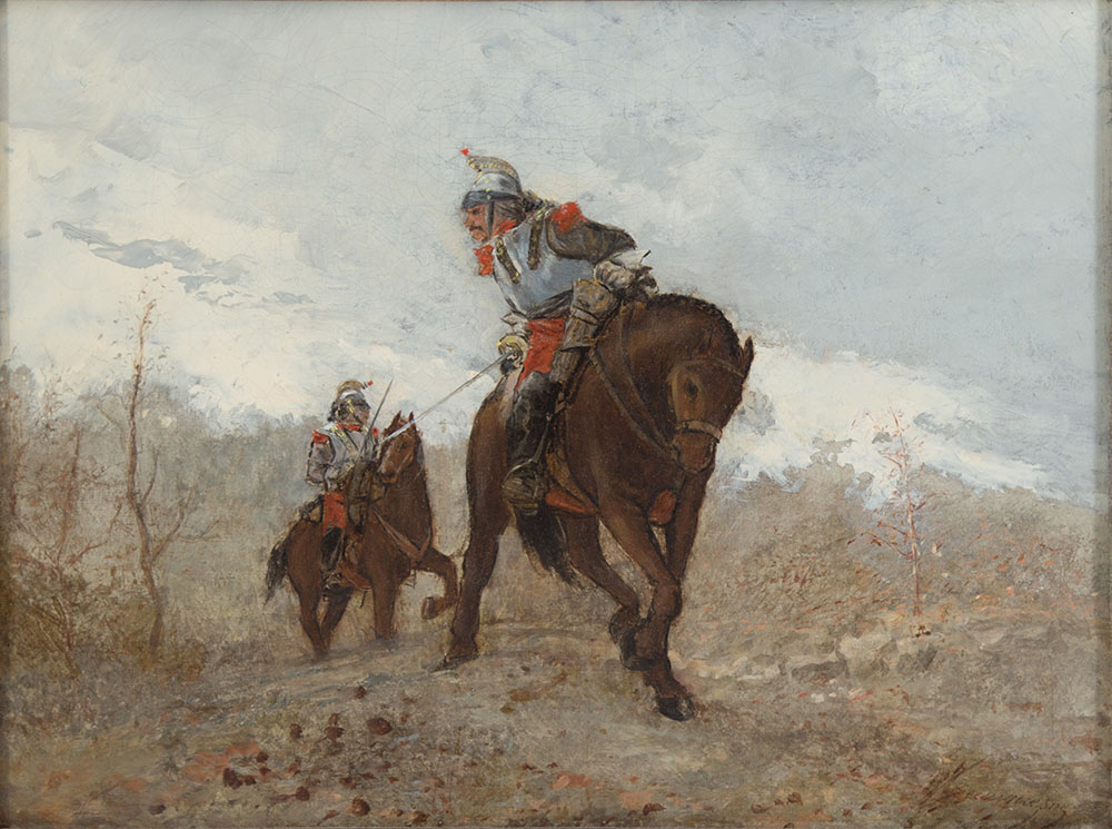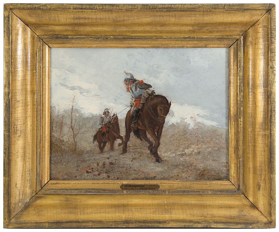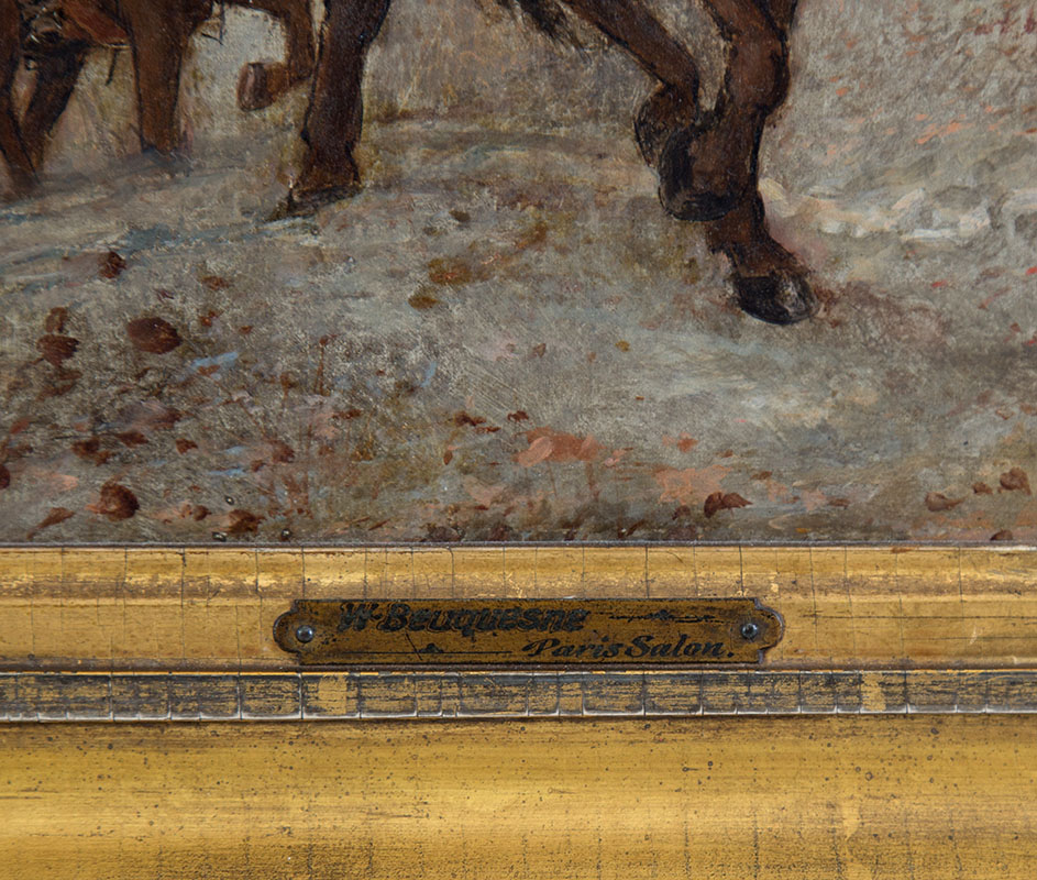 BEAUQUESNE, Wilfred Constant, (French, 1847-1913): Several French Soldiers on Horseback in Pursuit, Oil/Canvas, 11 '' x 14'', signed lower right, period gilded frame 16.25'' x 19.75''. Wilfred Constant Beauquesne was widely known for his scenic depictions of war.